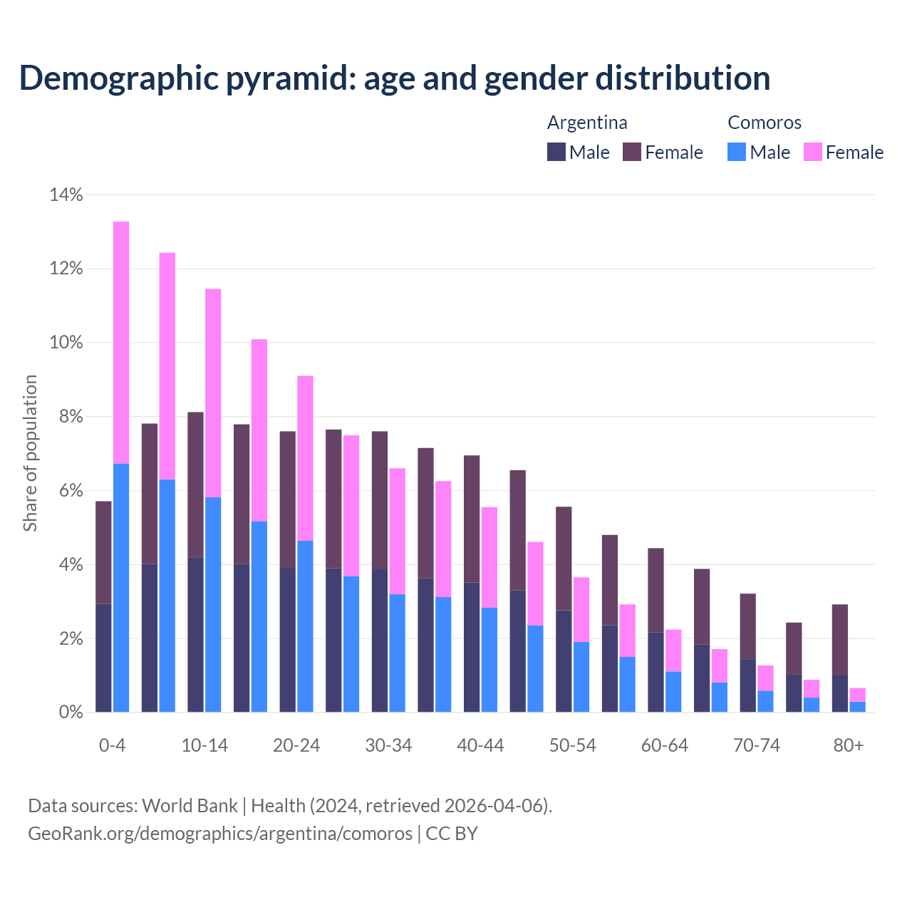 - As of 2026, the population of Argentina is 46M vs 904K in Comoros - 51 times difference.