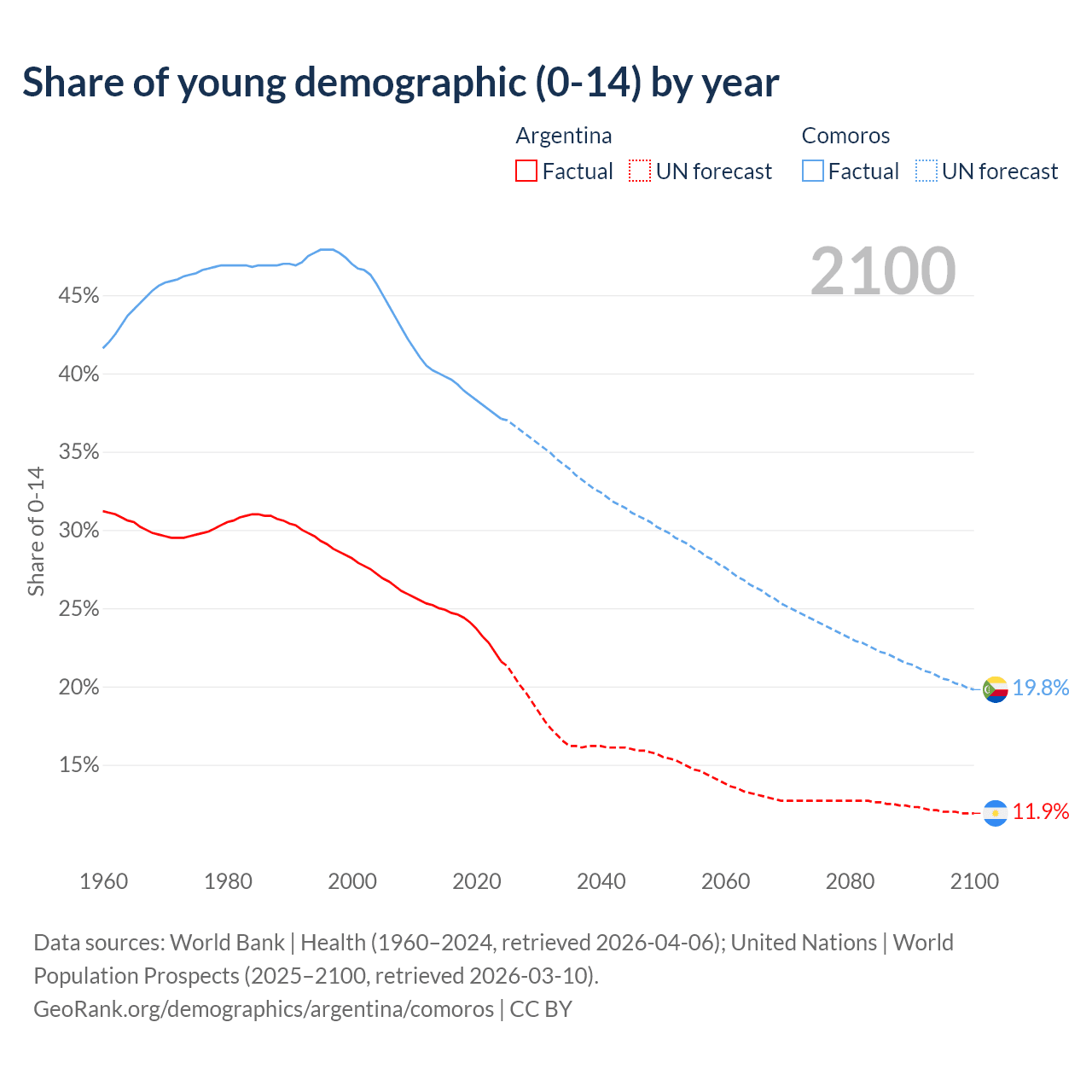 - The share of young demographic (0-15 years old) in Argentina is 21.6% vs 37.1% in Comoros.