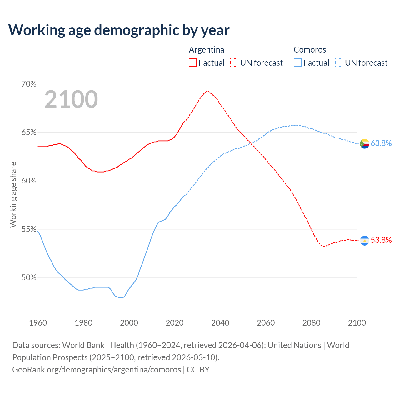 - Argentina has 30.4M working age adults (aged 15-64) vs 528K in Comoros.