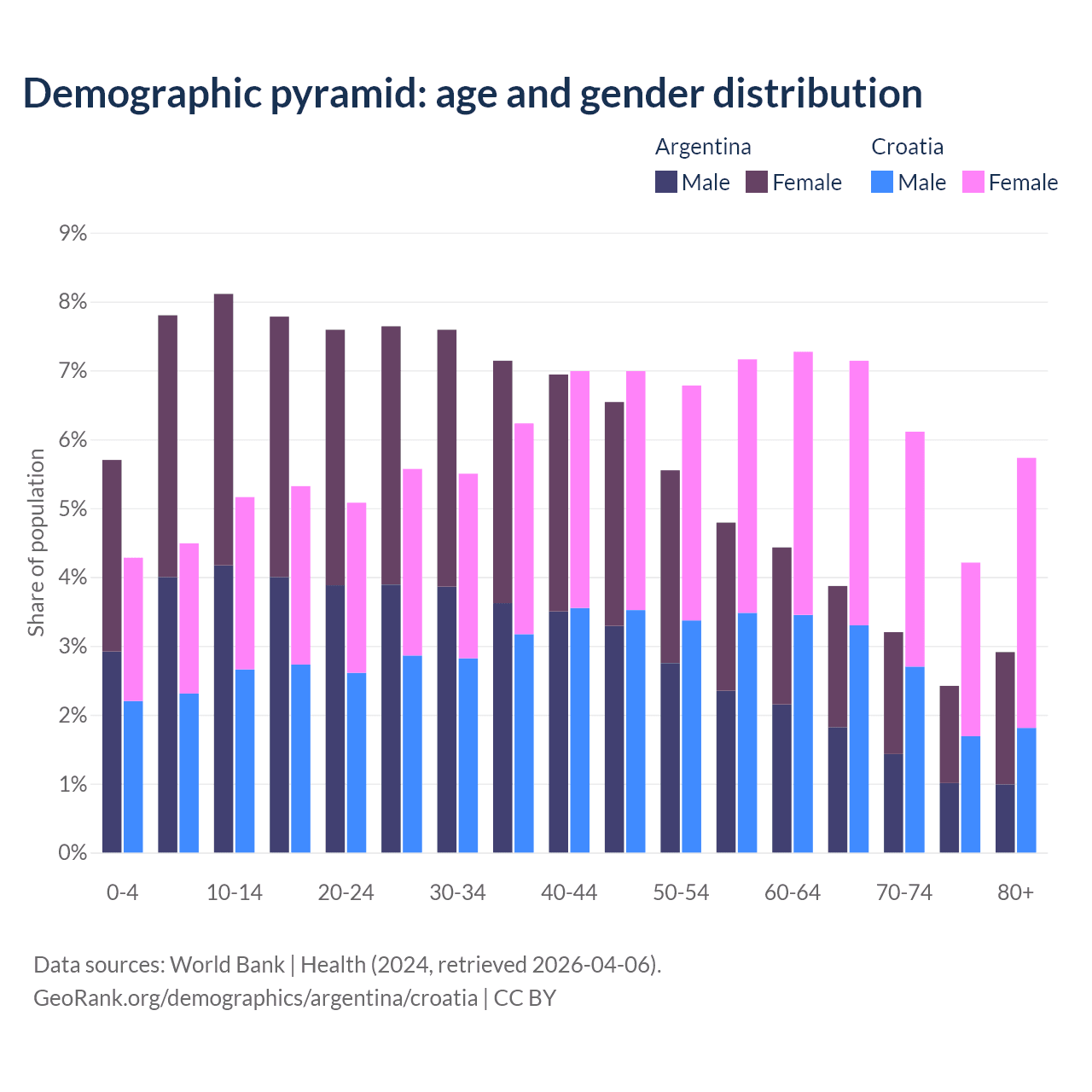 - Argentina is ranked 85/196 by median age (oldest to youngest) vs 11/196 for Croatia.