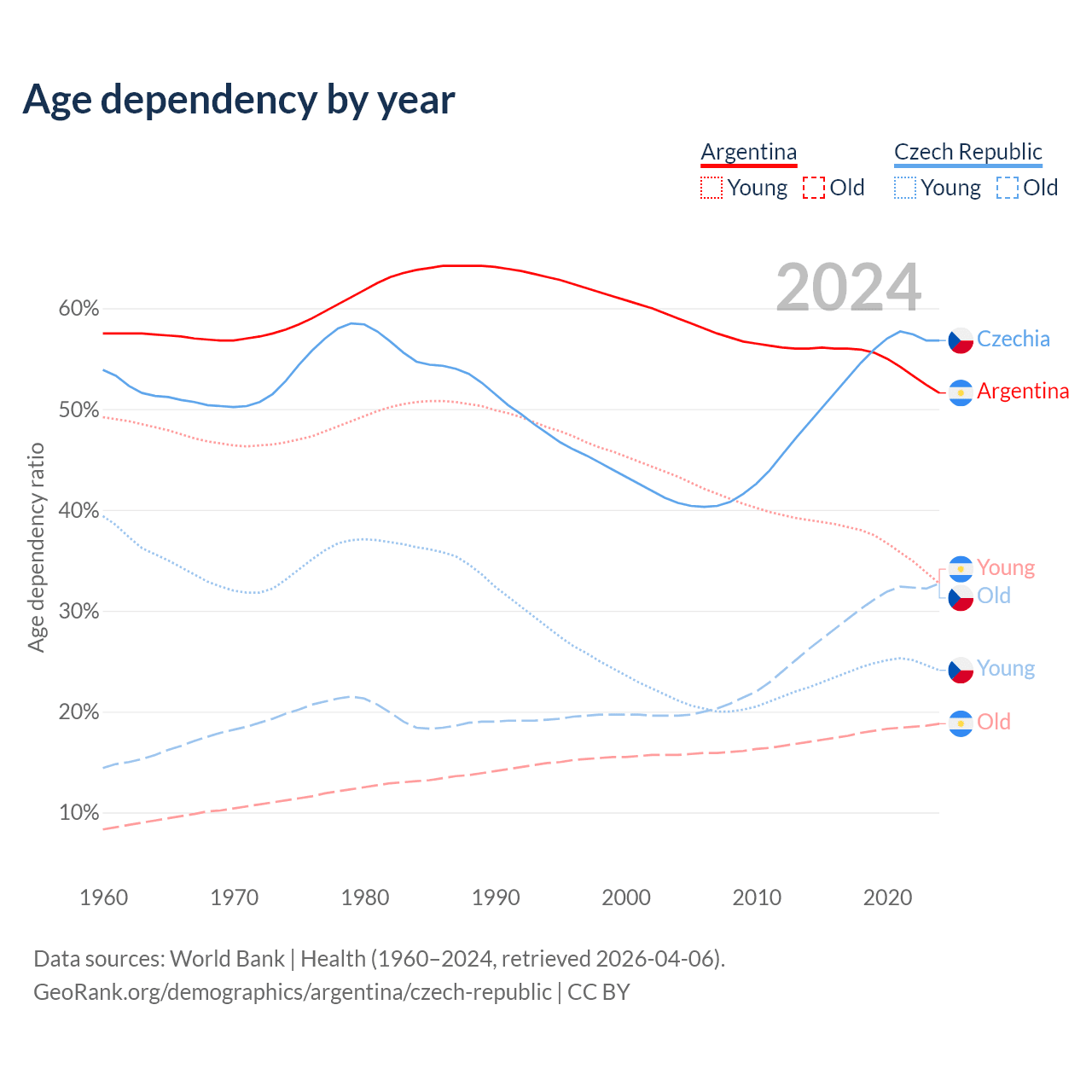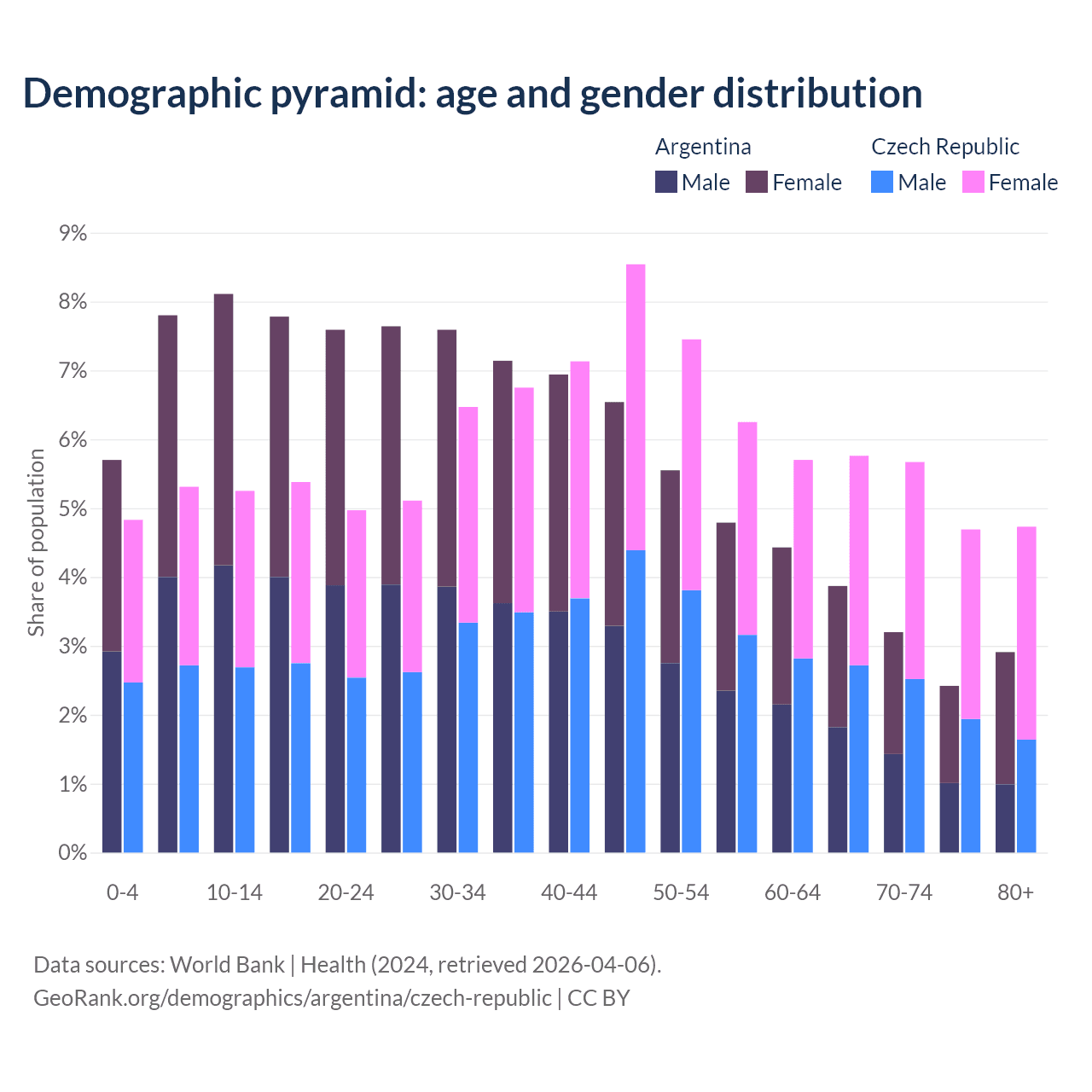 - Argentina is ranked 85/196 by median age (oldest to youngest) vs 21/196 for the Czech Republic.