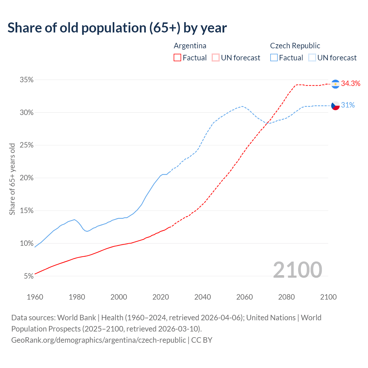 The share of older people aged 65 and over is 12.4% in Argentina and 20.8% in the Czech Republic. Life expectancy in Argentina compared to the Czech Republic .