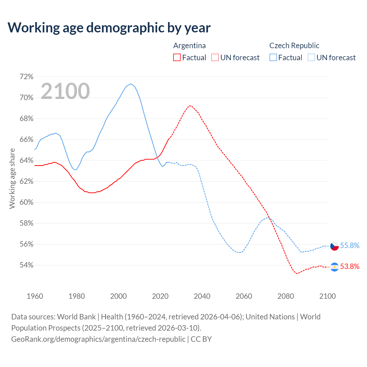 - Argentina has 30.4M working age adults (aged 15-64) vs 6.79M in the Czech Republic.