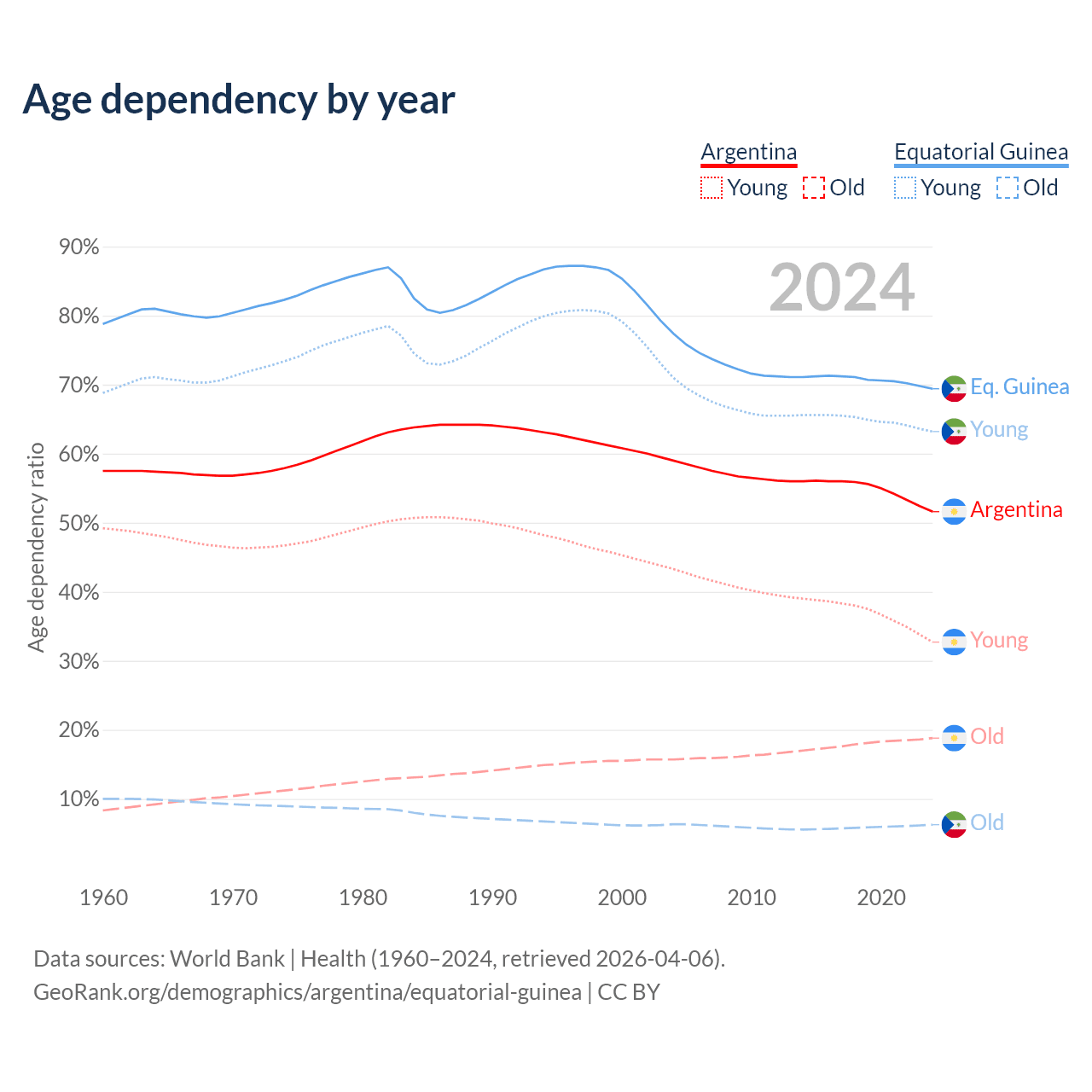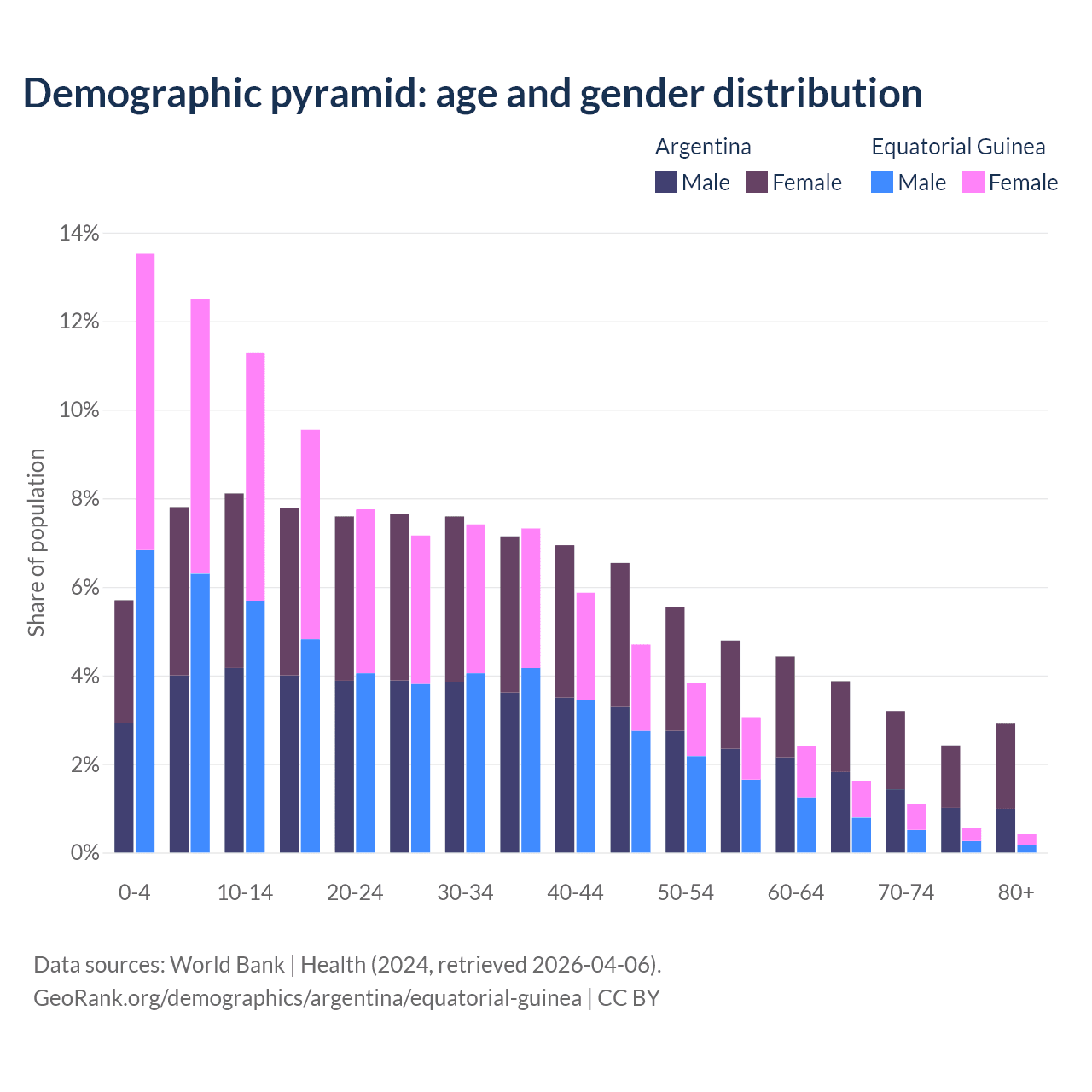- The share of old-age demographic (65+) in Argentina is 12.4% vs 3.69% in Equatorial Guinea.