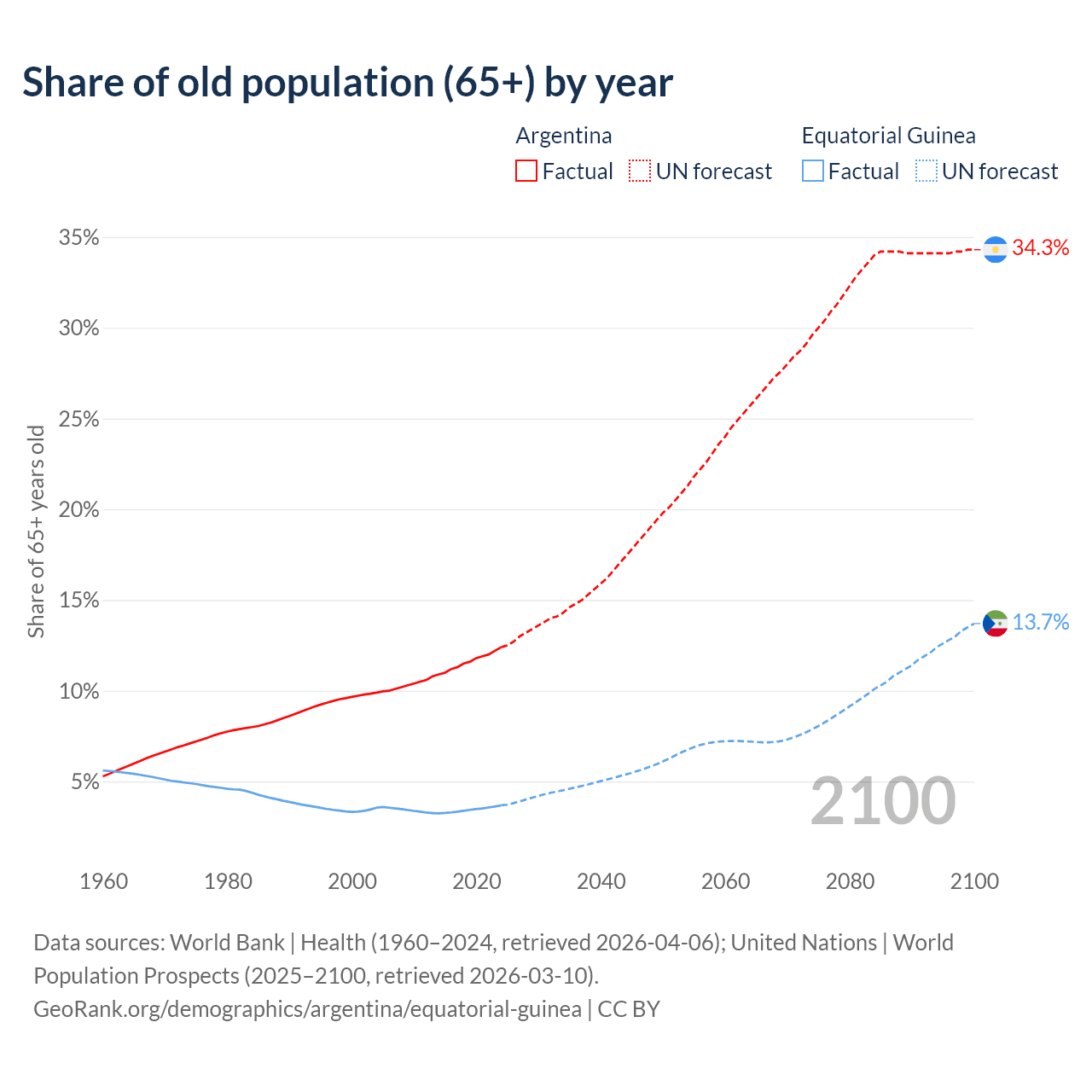 The share of older people aged 65 and over is 12.4% in Argentina and 3.69% in Equatorial Guinea. Life expectancy in Argentina compared to Equatorial Guinea .