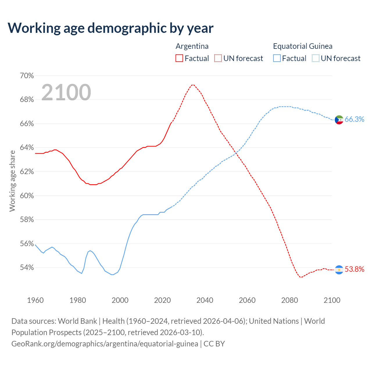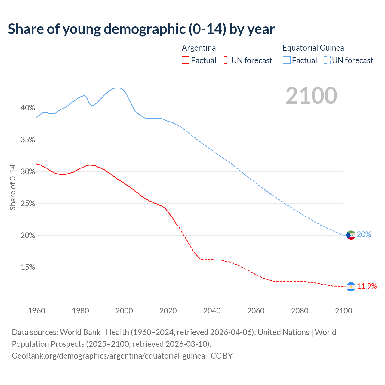 Median age Argentina vs Equatorial Guinea, 1960-2100