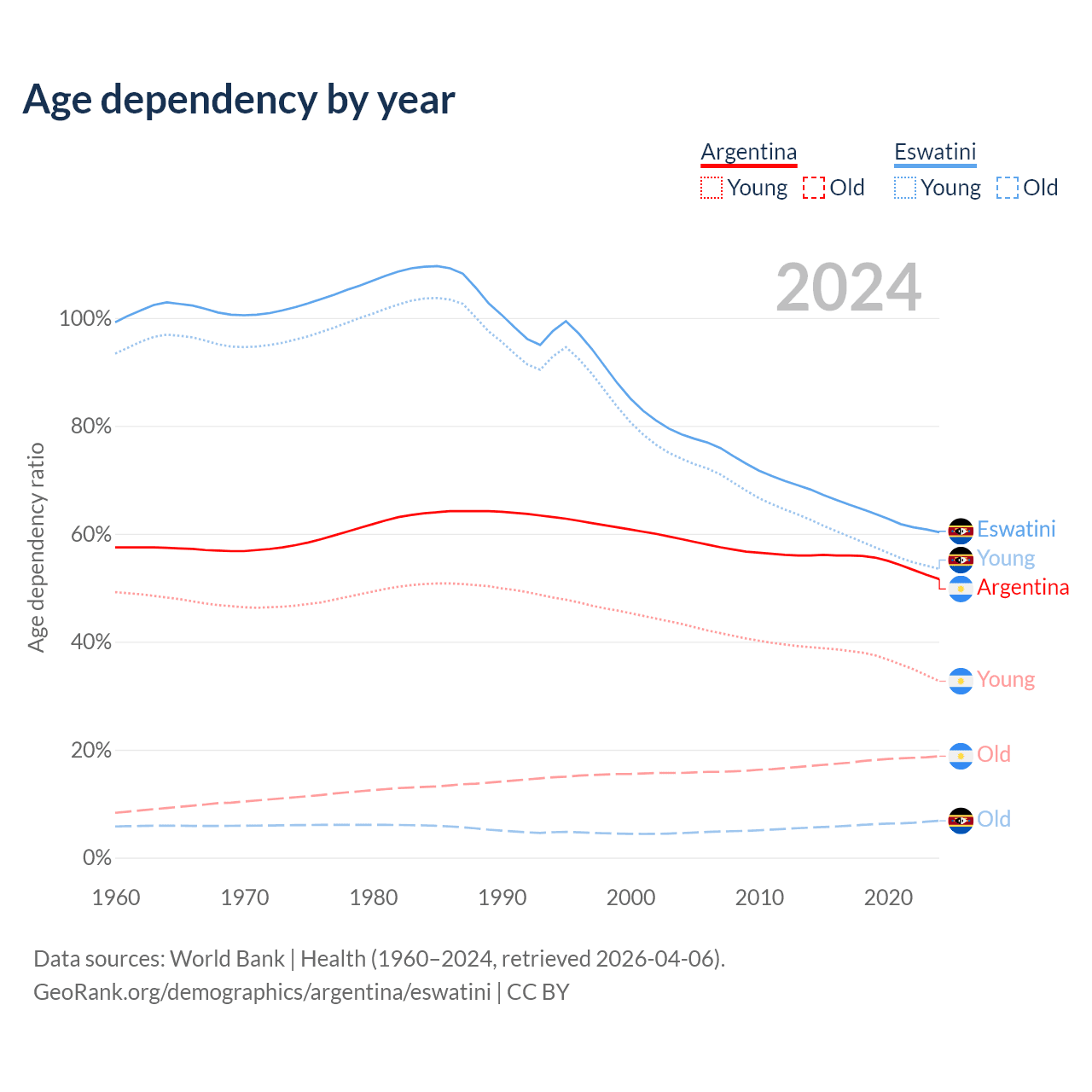 - Argentina is ranked 85/196 by median age (oldest to youngest) vs 141/196 for Eswatini.