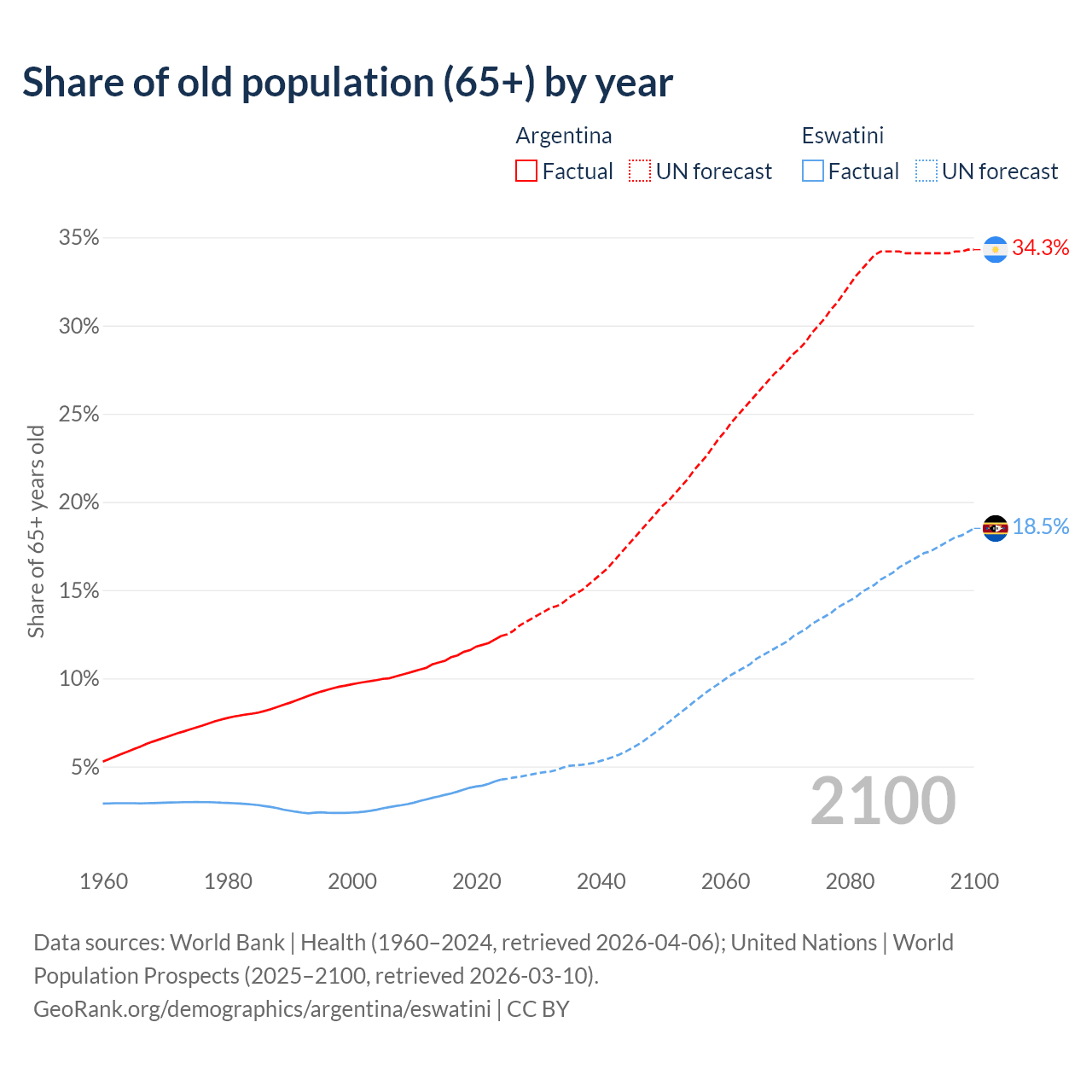The share of older people aged 65 and over is 12.4% in Argentina and 4.26% in Eswatini. Life expectancy in Argentina compared to Eswatini .