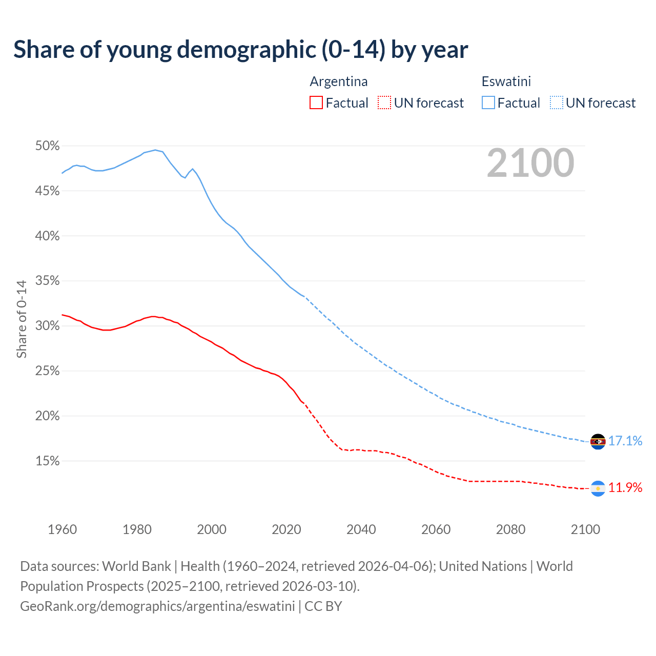 - The share of young demographic (0-15 years old) in Argentina is 21.6% vs 33.4% in Eswatini.