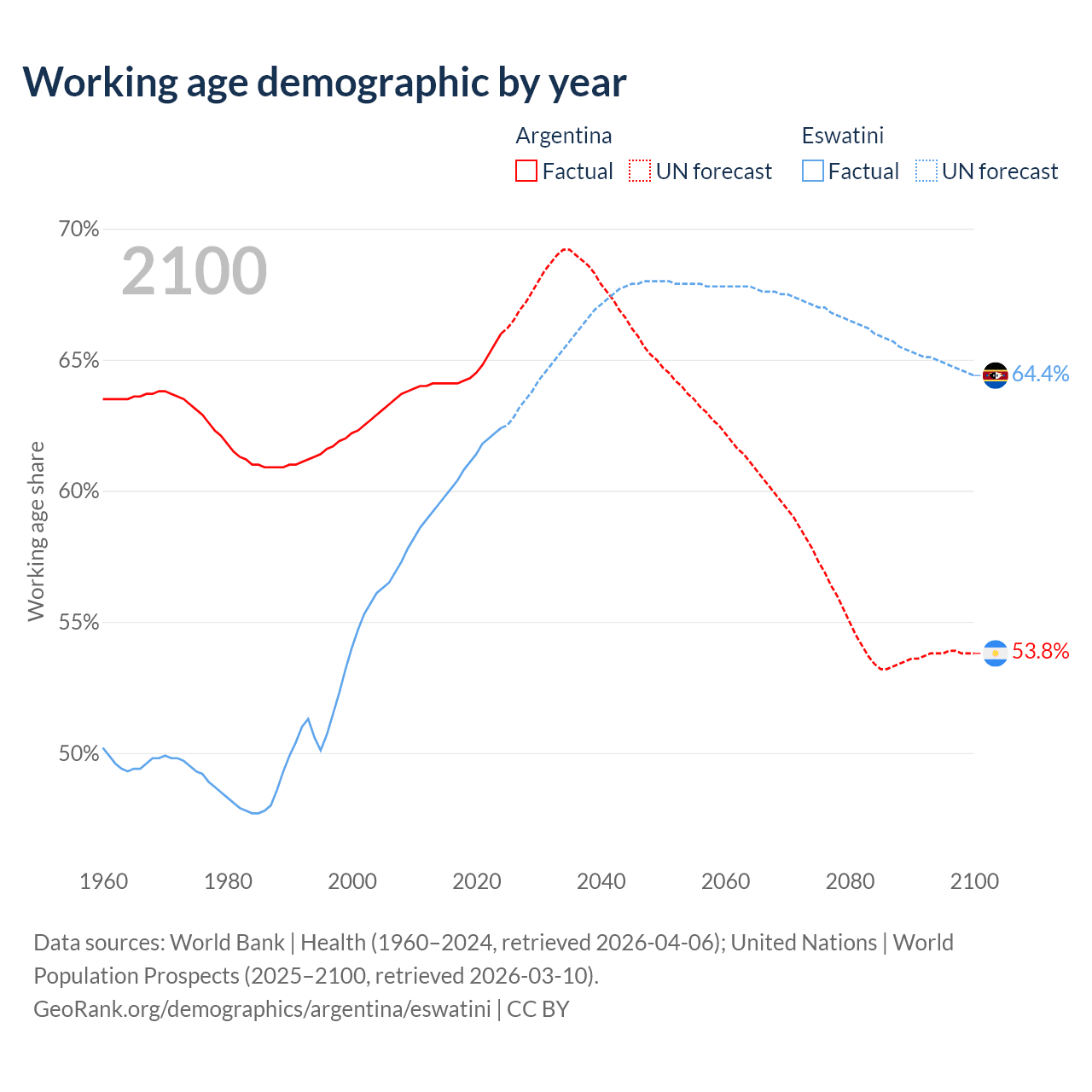 - Argentina has 30.4M working age adults (aged 15-64) vs 794K in Eswatini.
