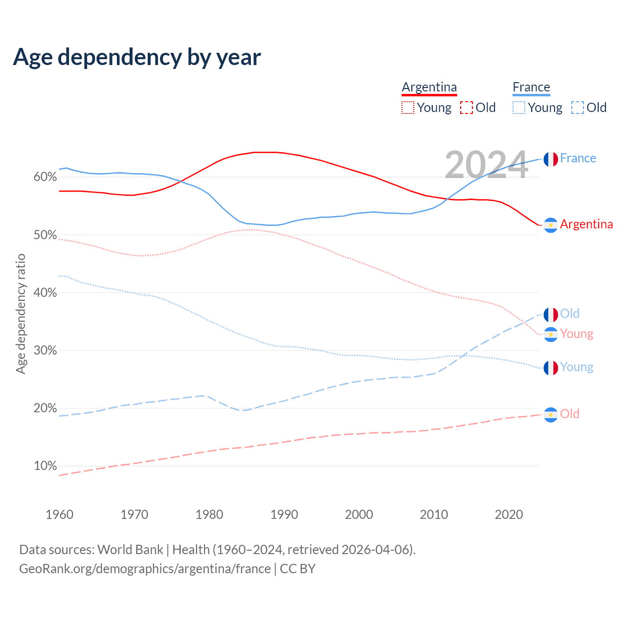 - Argentina is ranked 85/196 by median age (oldest to youngest) vs 29/196 for France.