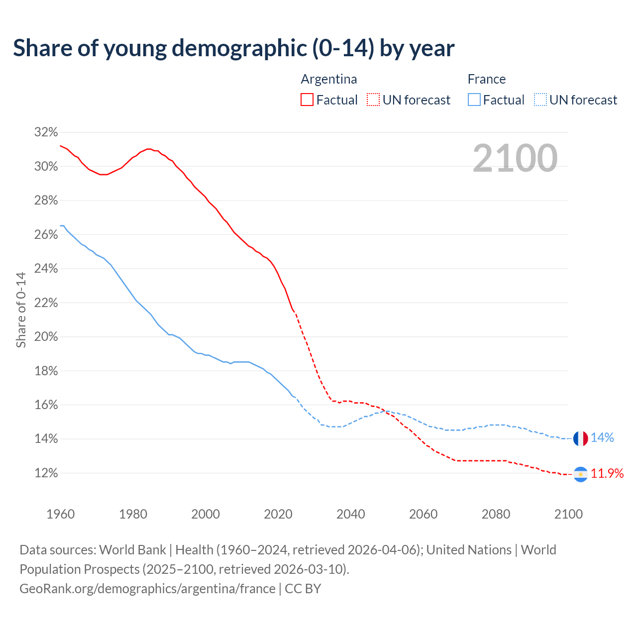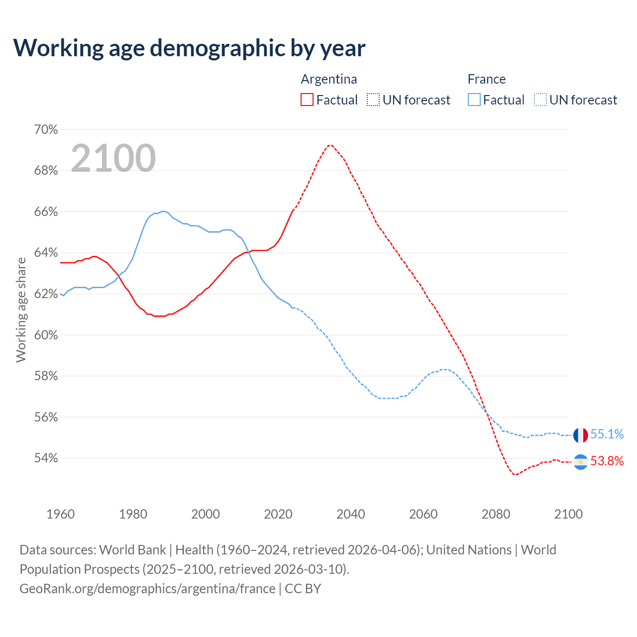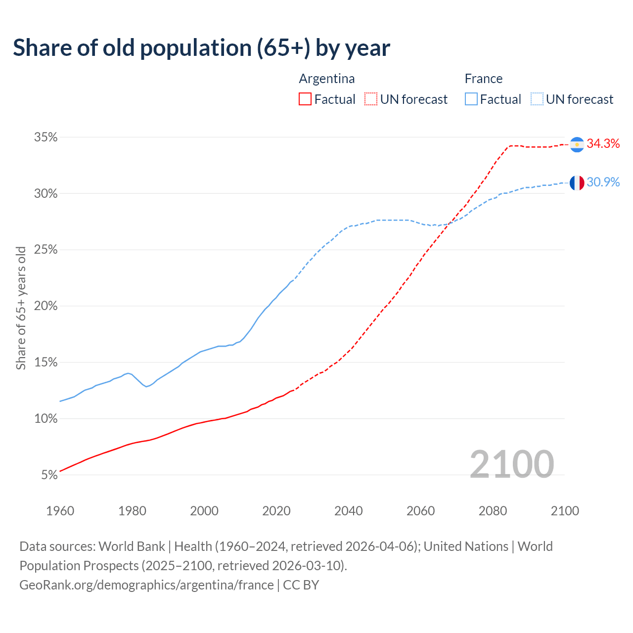 Median age Argentina vs France, 1960-2100