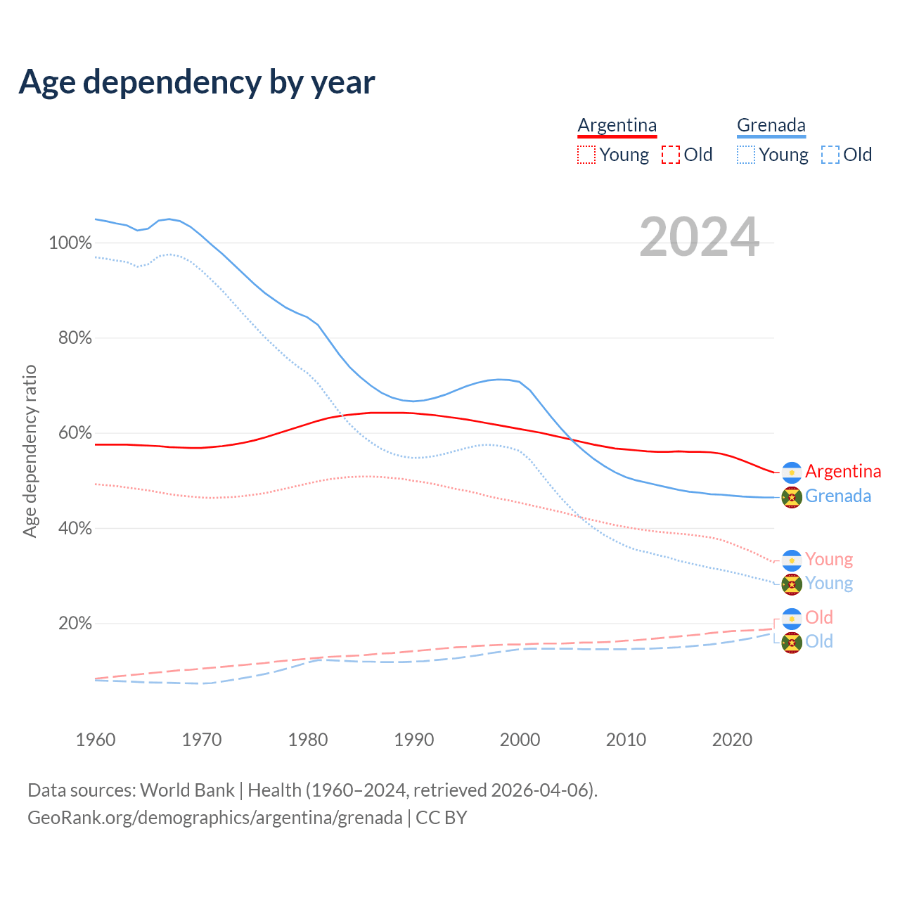 - Argentina is ranked 85/196 by median age (oldest to youngest) vs 77/196 for Grenada.