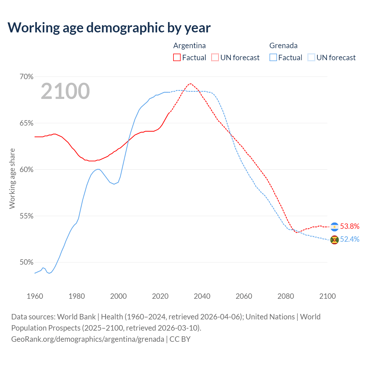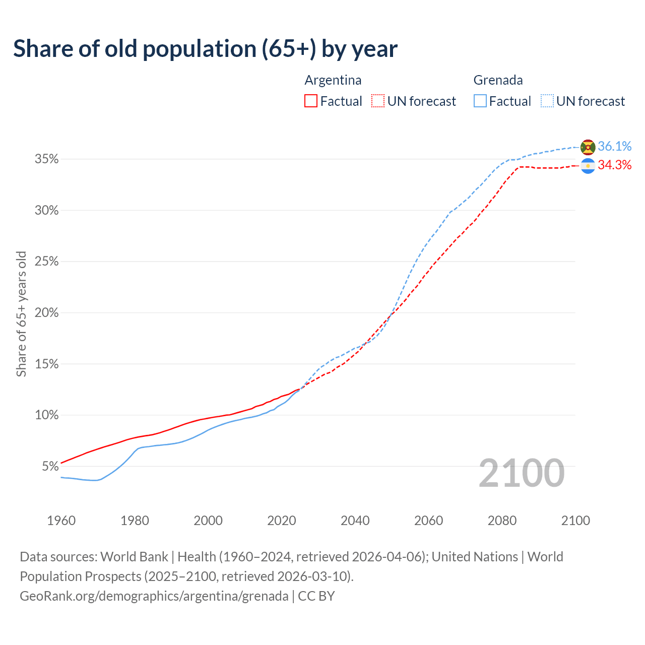 Median age Argentina vs Grenada, 1960-2100