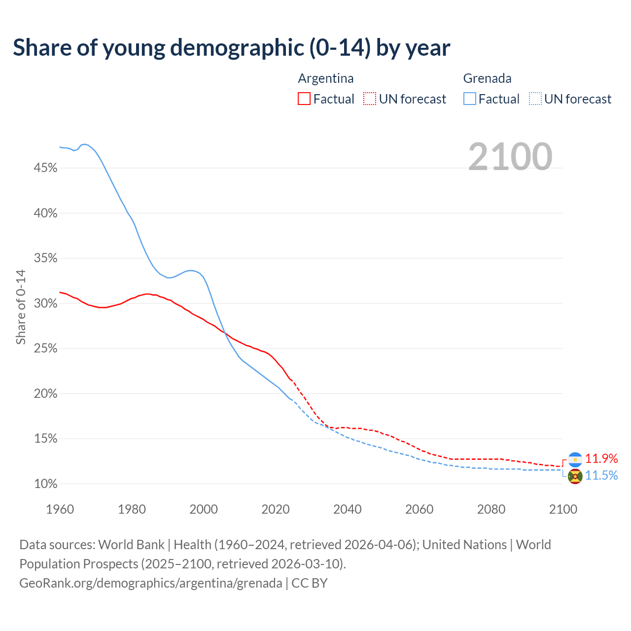 - The share of young demographic (0-15 years old) in Argentina is 21.6% vs 19.4% in Grenada.