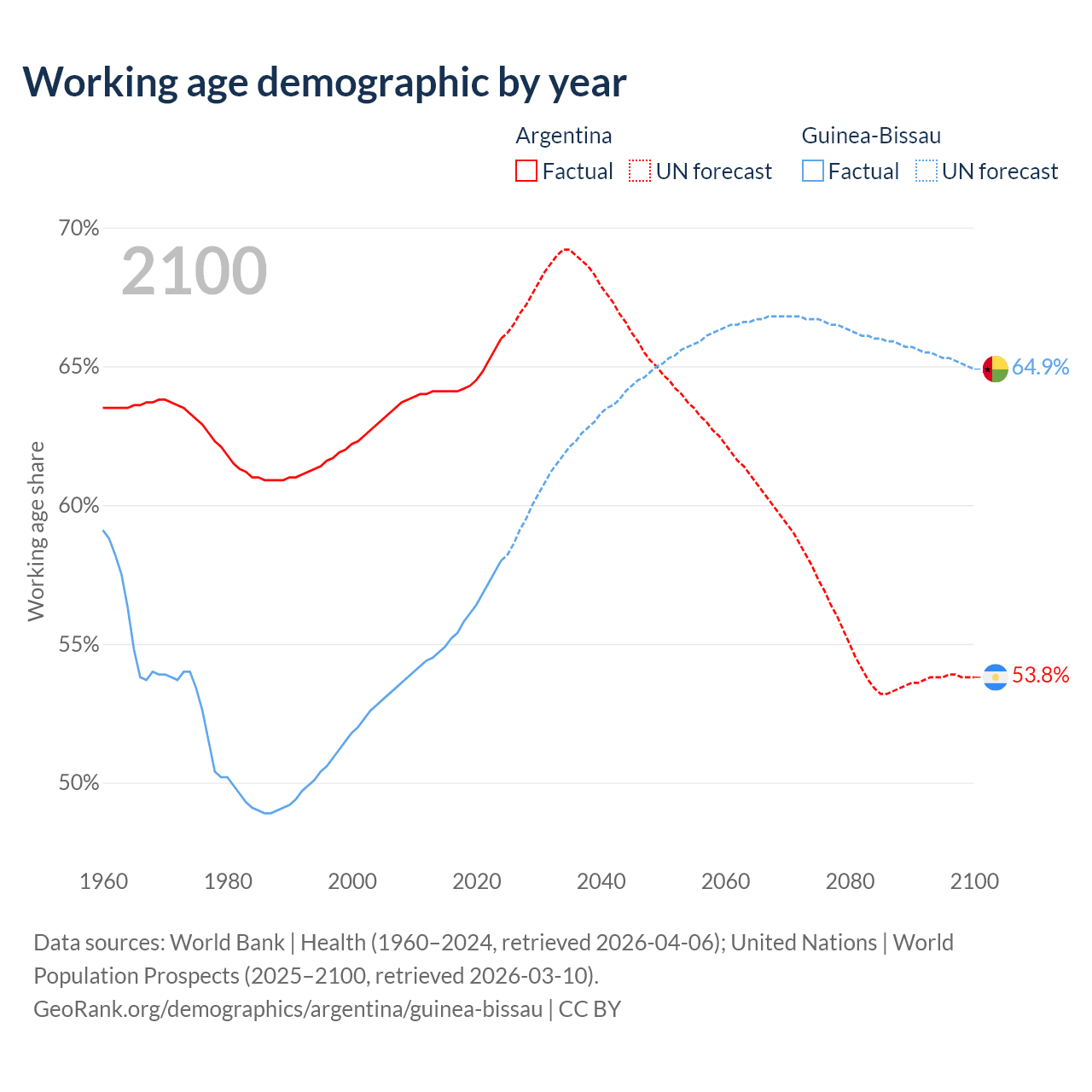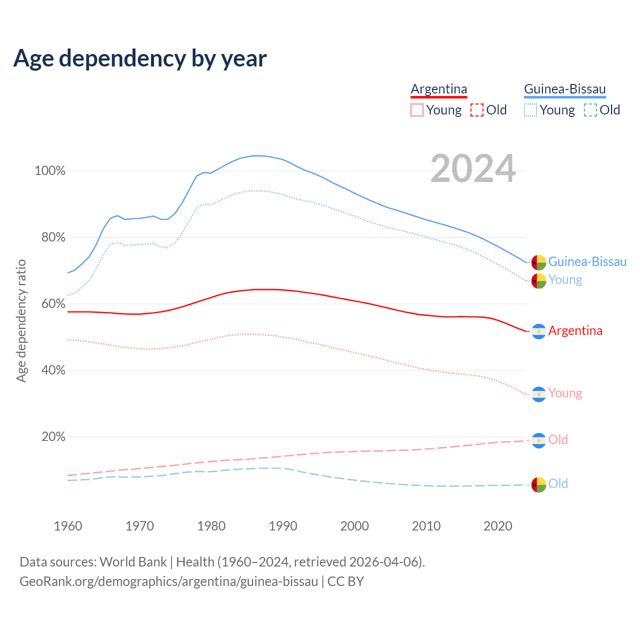 - Argentina is ranked 85/196 by median age (oldest to youngest) vs 164/196 for Guinea-Bissau.