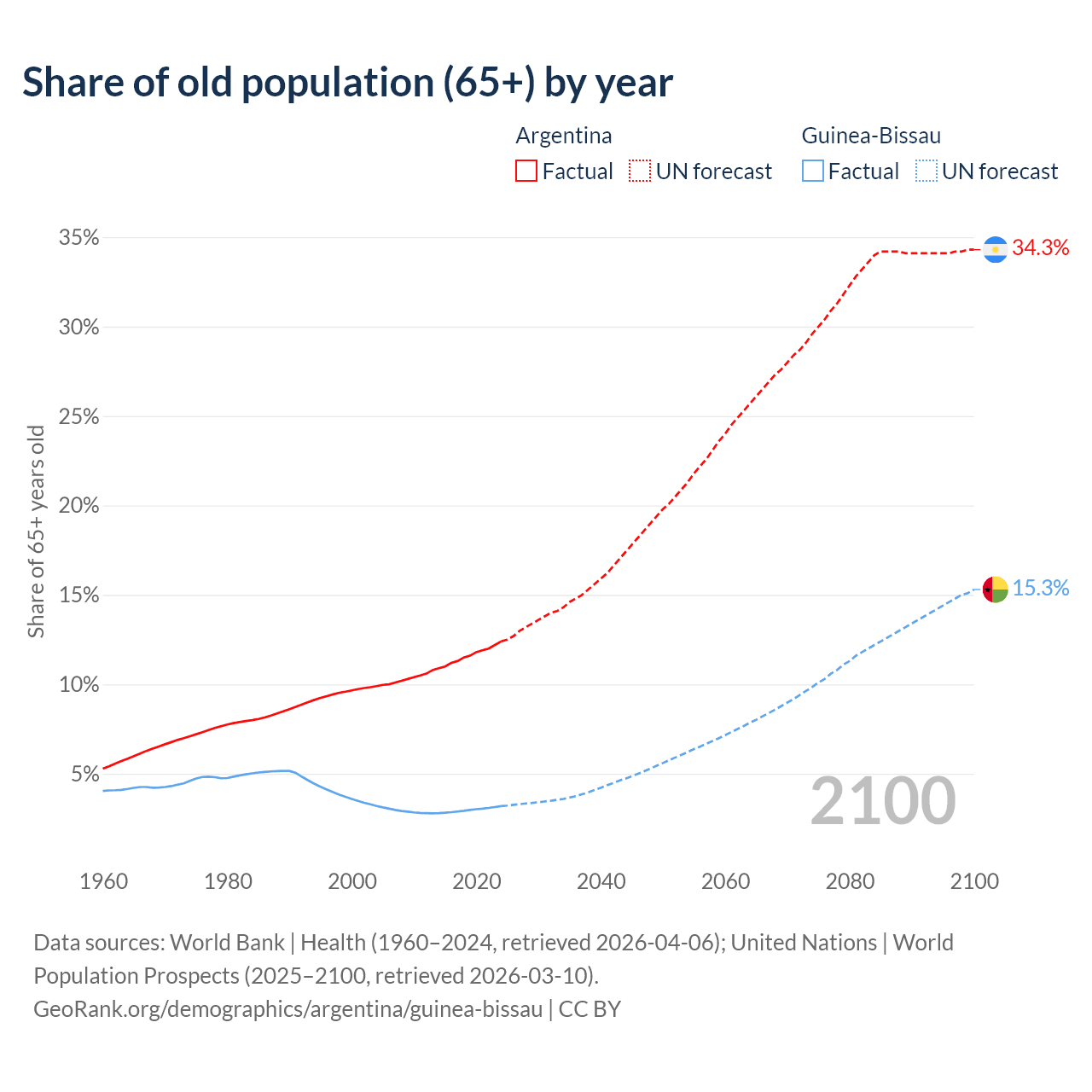 The share of older people aged 65 and over is 12.4% in Argentina and 3.19% in Guinea-Bissau. Life expectancy in Argentina compared to Guinea-Bissau .