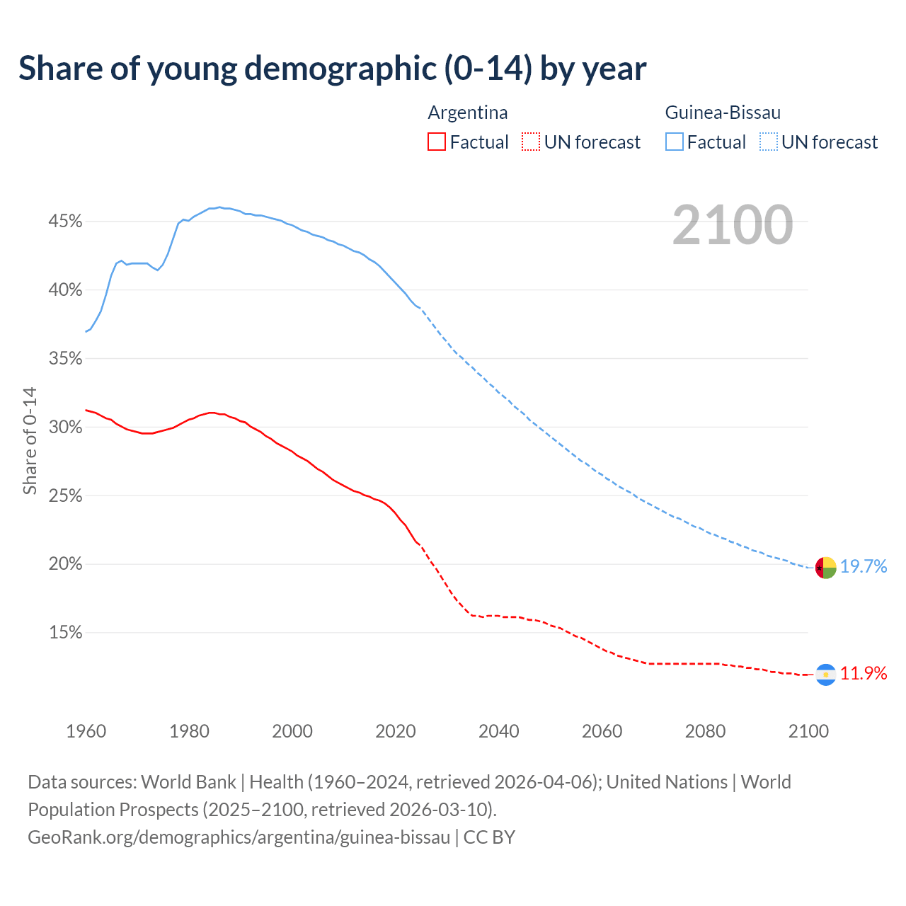 - The share of young demographic (0-15 years old) in Argentina is 21.6% vs 38.8% in Guinea-Bissau.