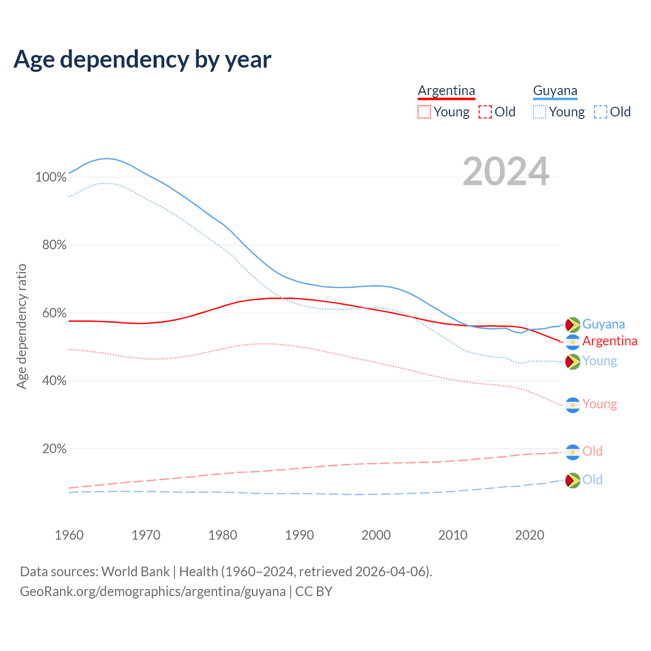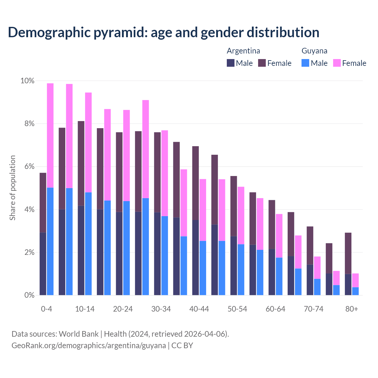 - Argentina is ranked 85/196 by median age (oldest to youngest) vs 122/196 for Guyana.