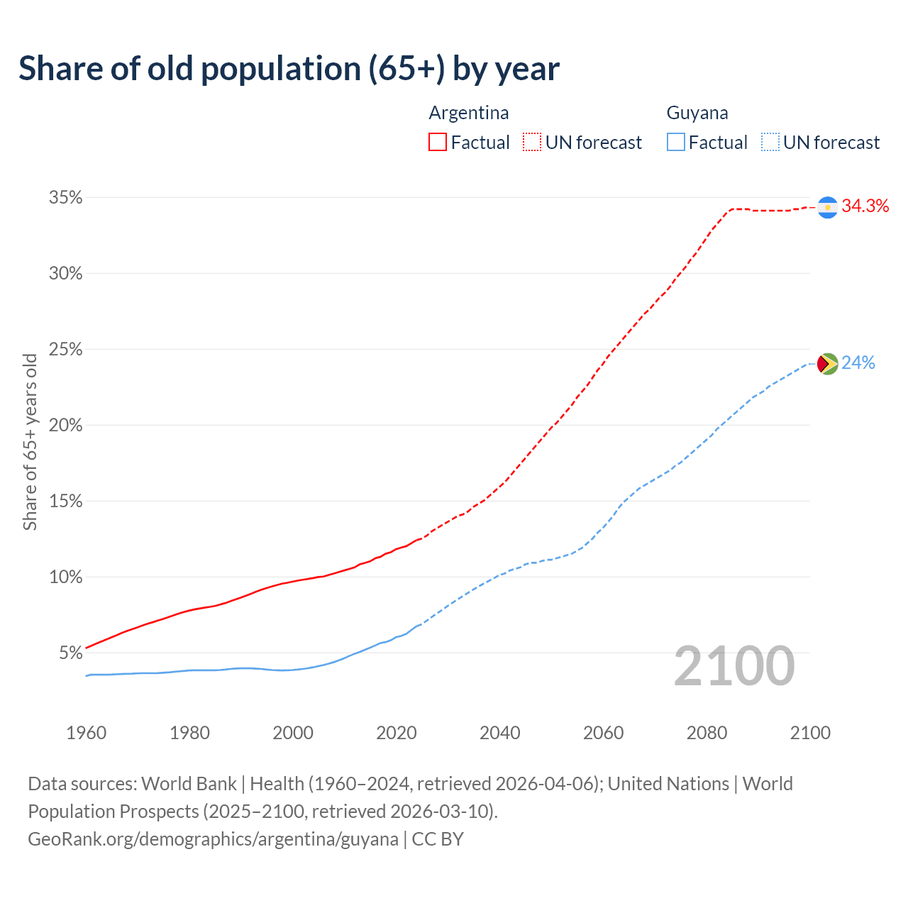 - The share of old-age demographic (65+) in Argentina is 12.4% vs 6.73% in Guyana.
