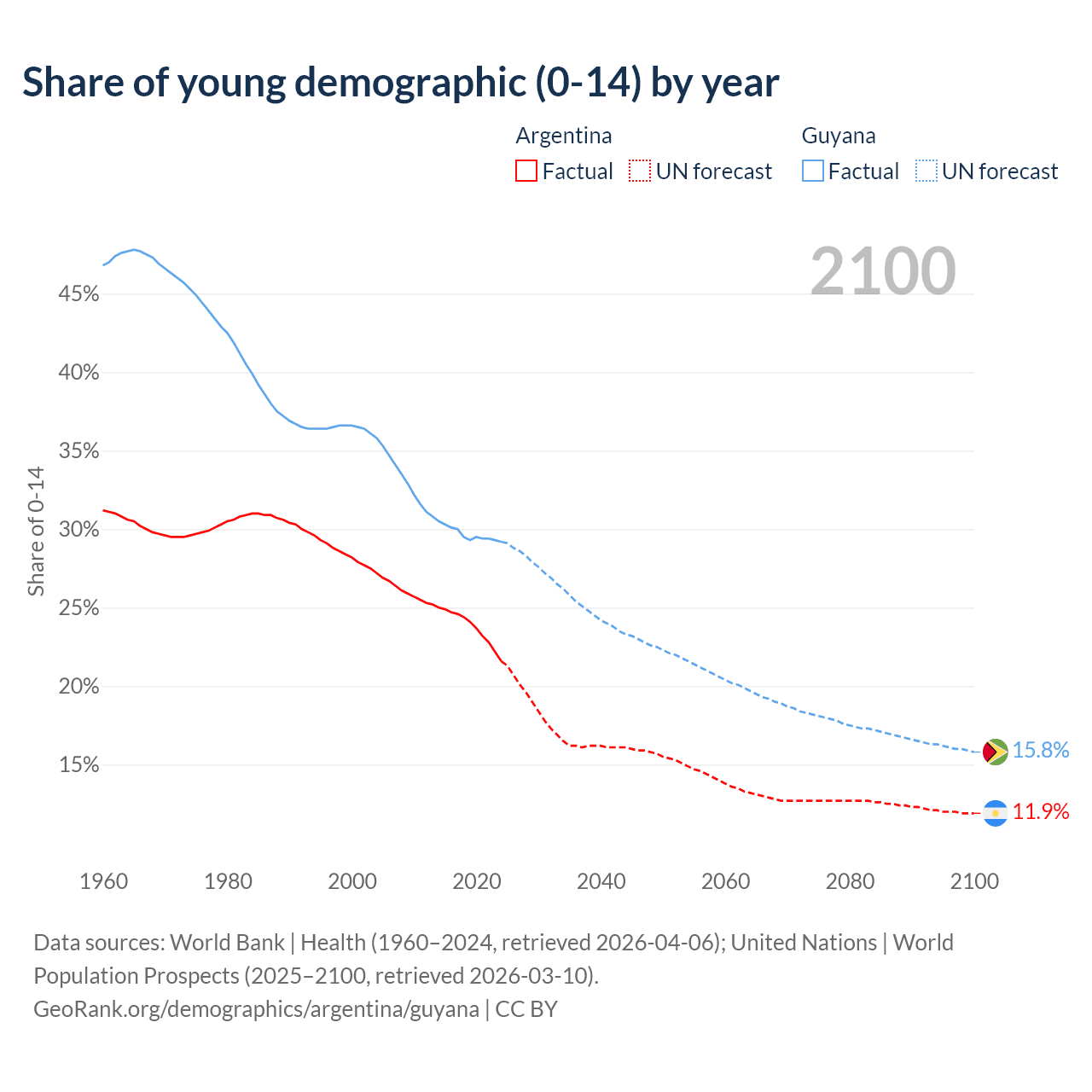 - The share of young demographic (0-15 years old) in Argentina is 21.6% vs 29.2% in Guyana.
