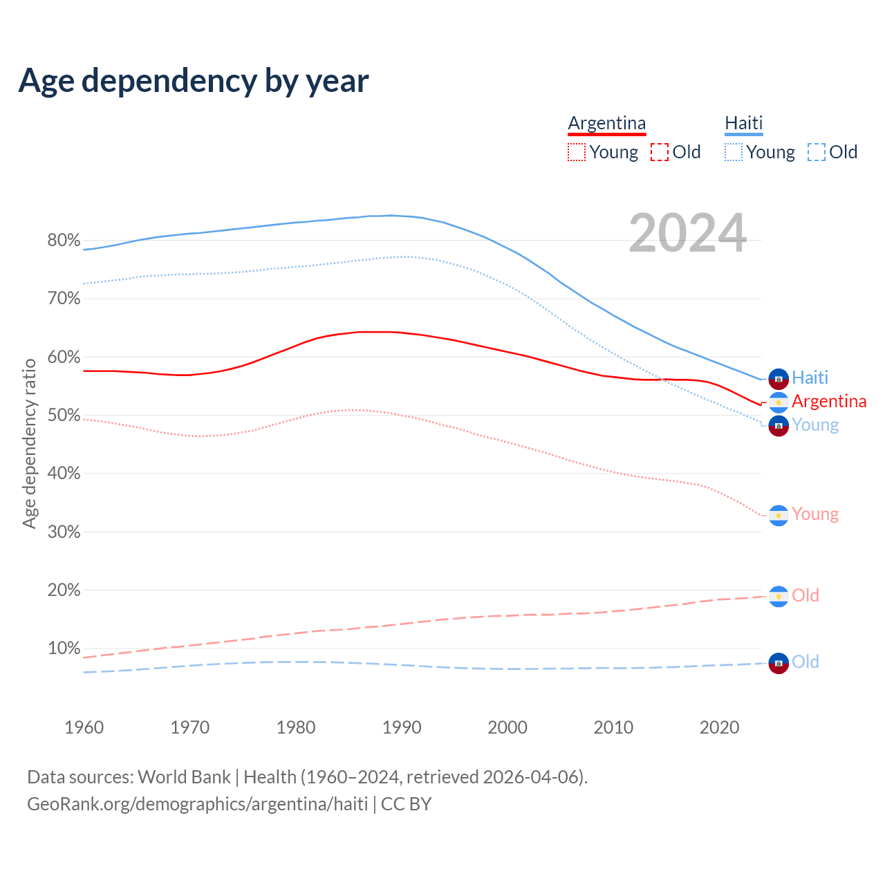 - Argentina is ranked 85/196 by median age (oldest to youngest) vs 135/196 for Haiti.