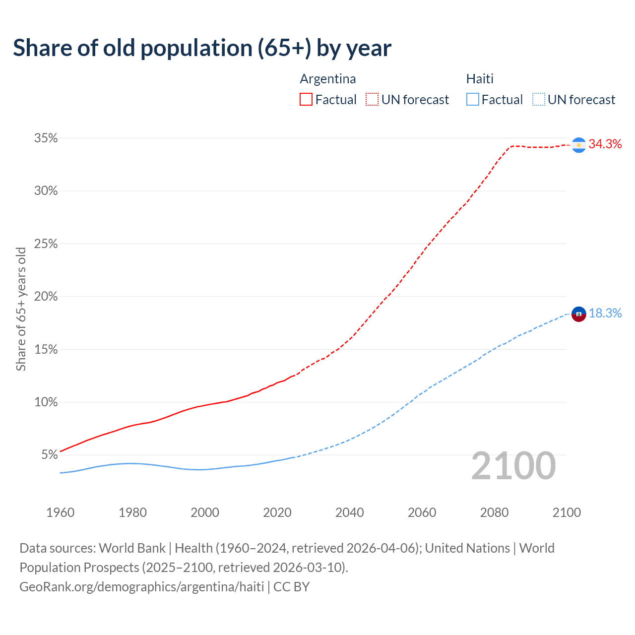 The share of older people aged 65 and over is 12.4% in Argentina and 4.71% in Haiti. Life expectancy in Argentina compared to Haiti .