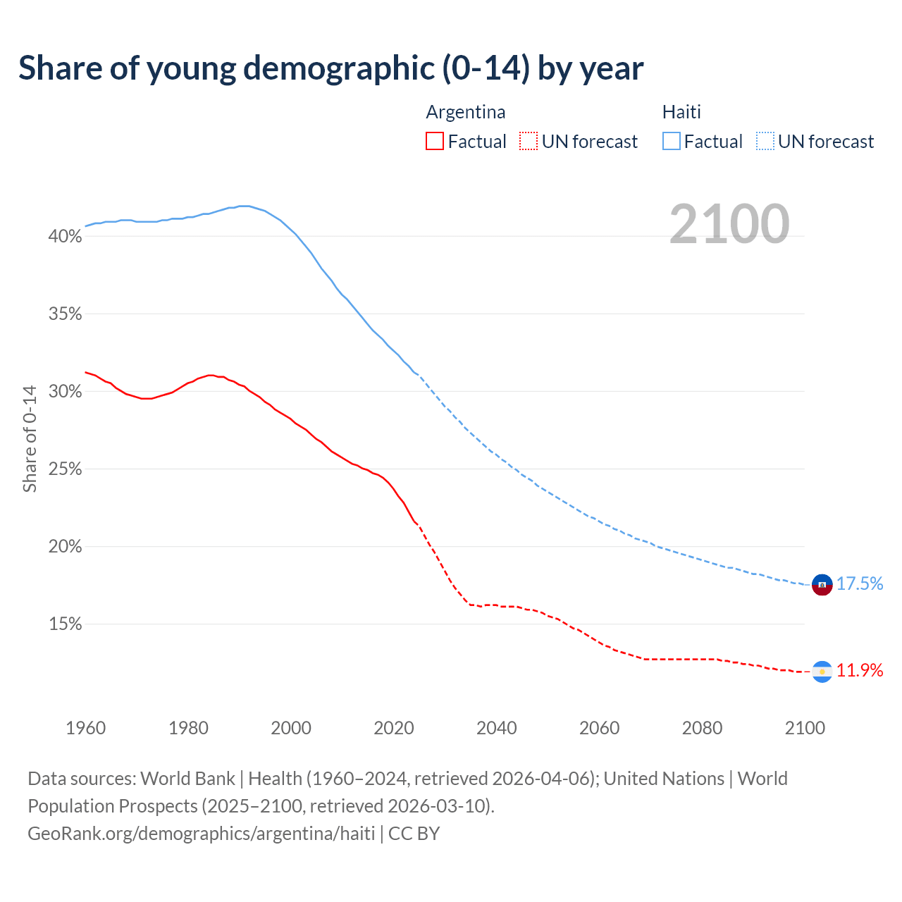 - The share of young demographic (0-15 years old) in Argentina is 21.6% vs 31.2% in Haiti.