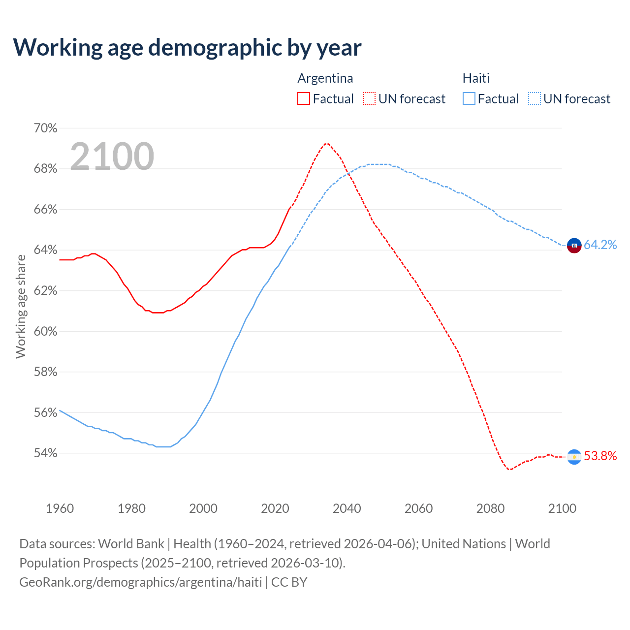 - Argentina has 30.4M working age adults (aged 15-64) vs 7.74M in Haiti.