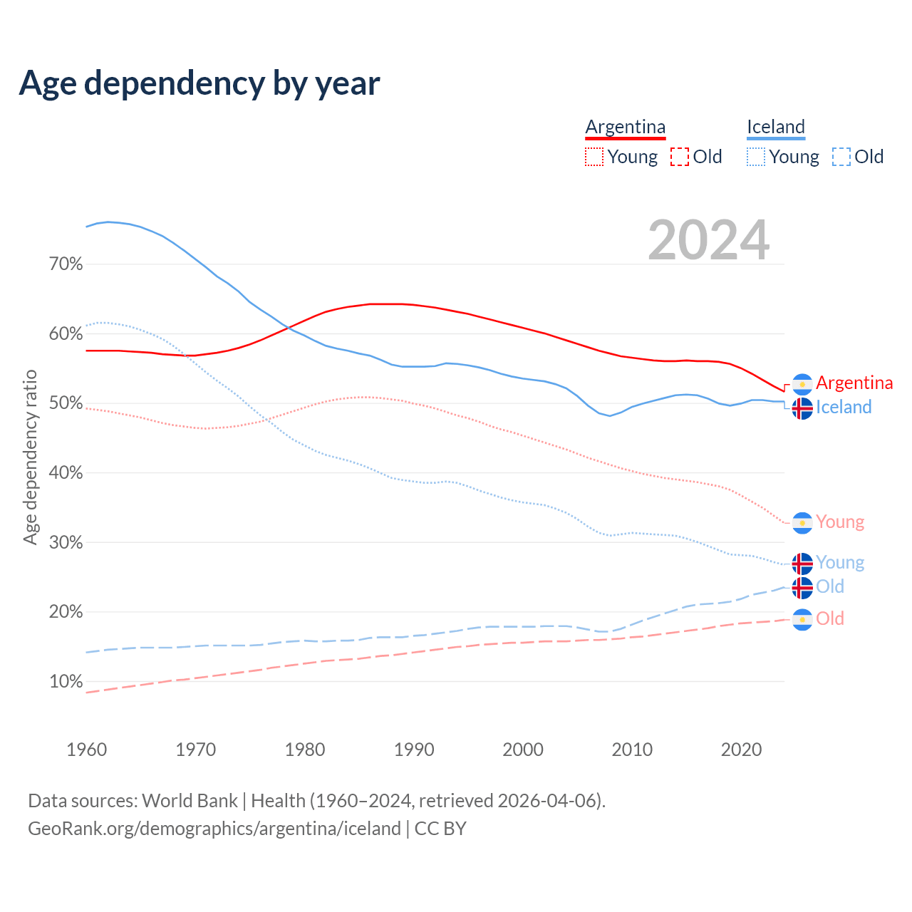 - Argentina is ranked 85/196 by median age (oldest to youngest) vs 65/196 for Iceland.