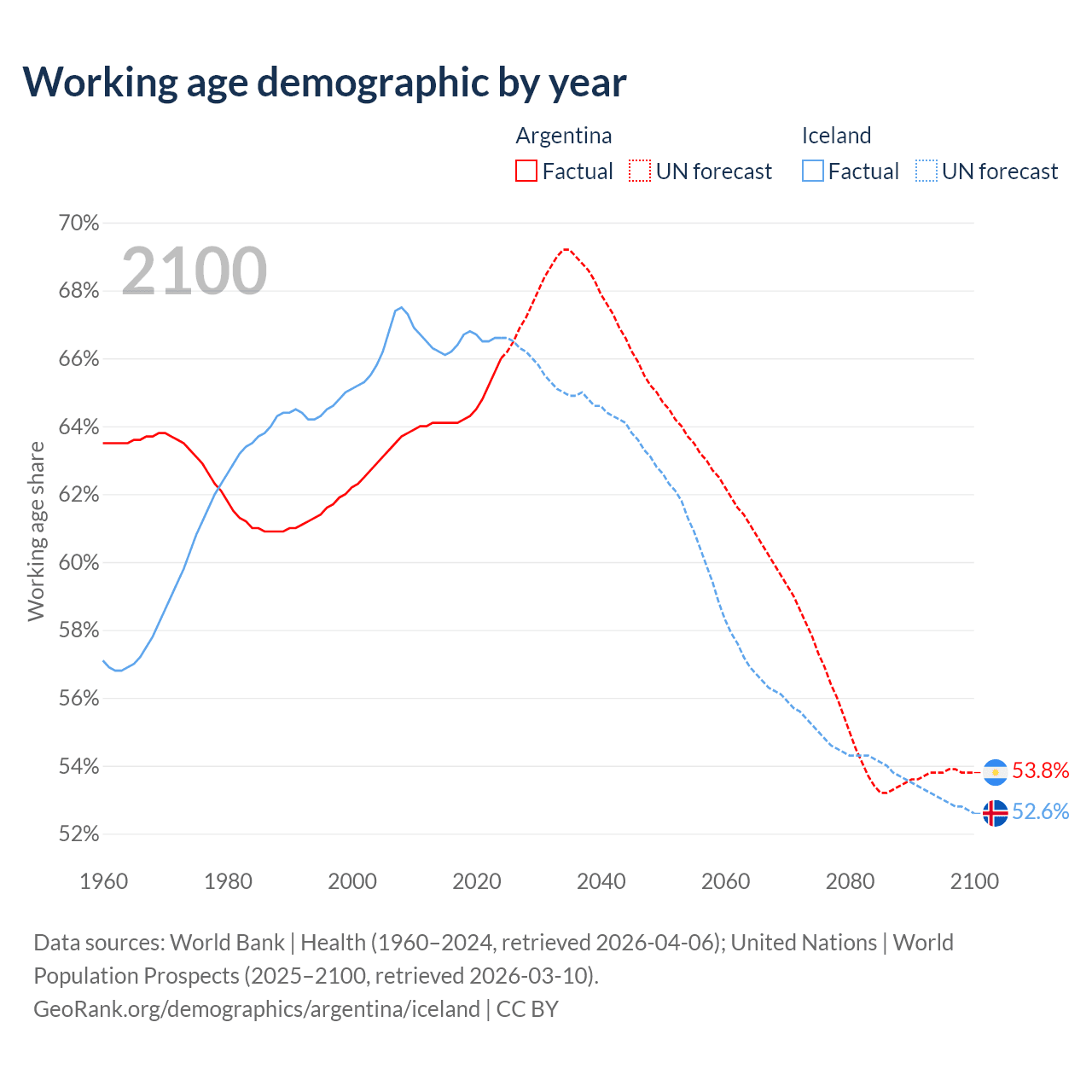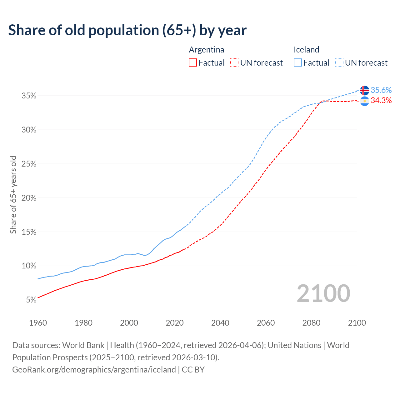 Median age Argentina vs Iceland, 1960-2100