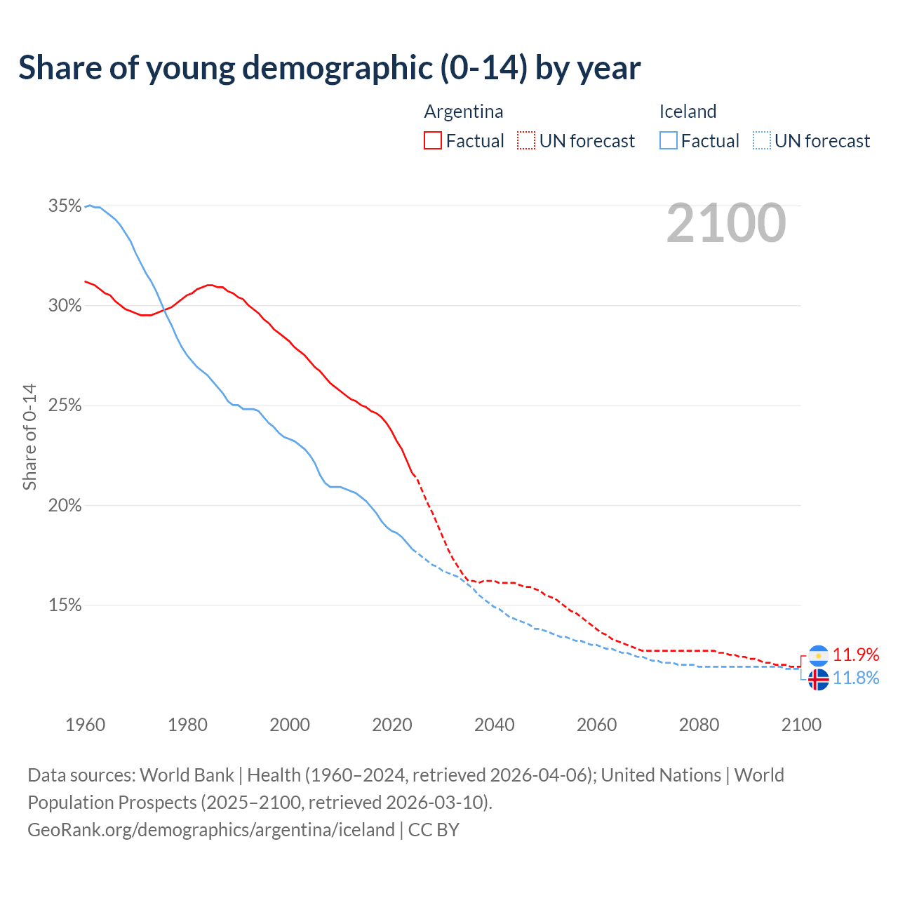 - The share of young demographic (0-15 years old) in Argentina is 21.6% vs 17.8% in Iceland.