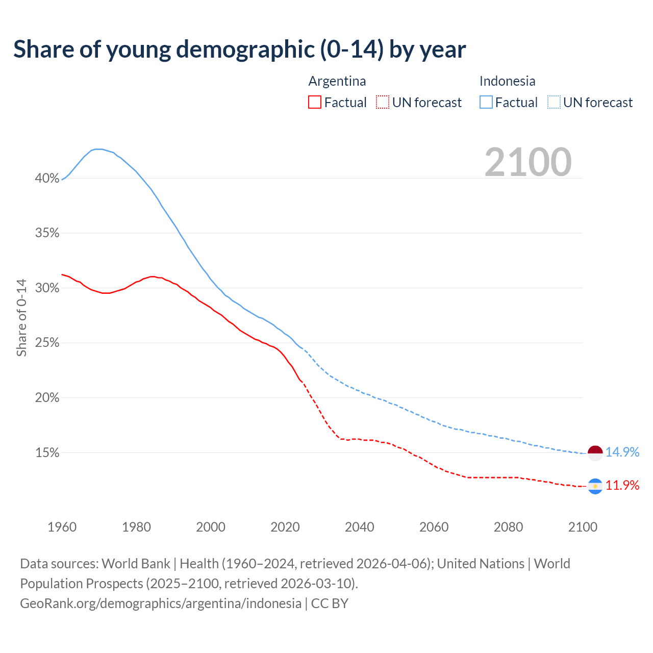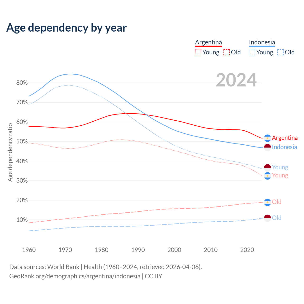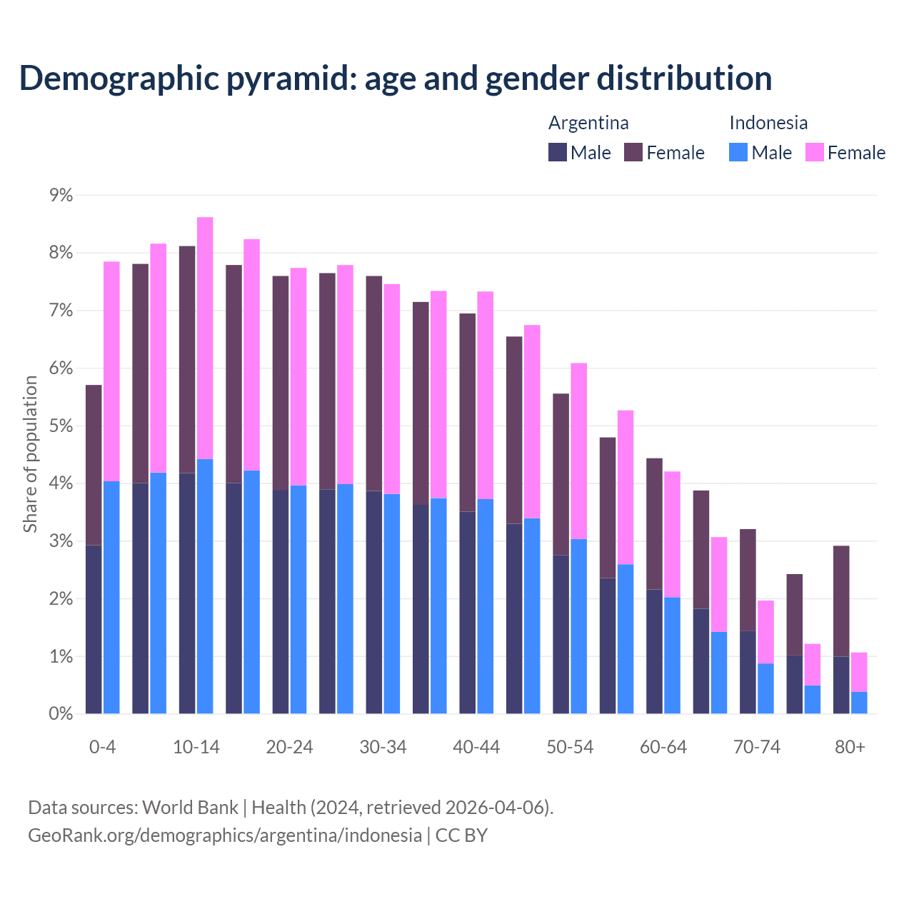 - Argentina is ranked 85/196 by median age (oldest to youngest) vs 93/196 for Indonesia.