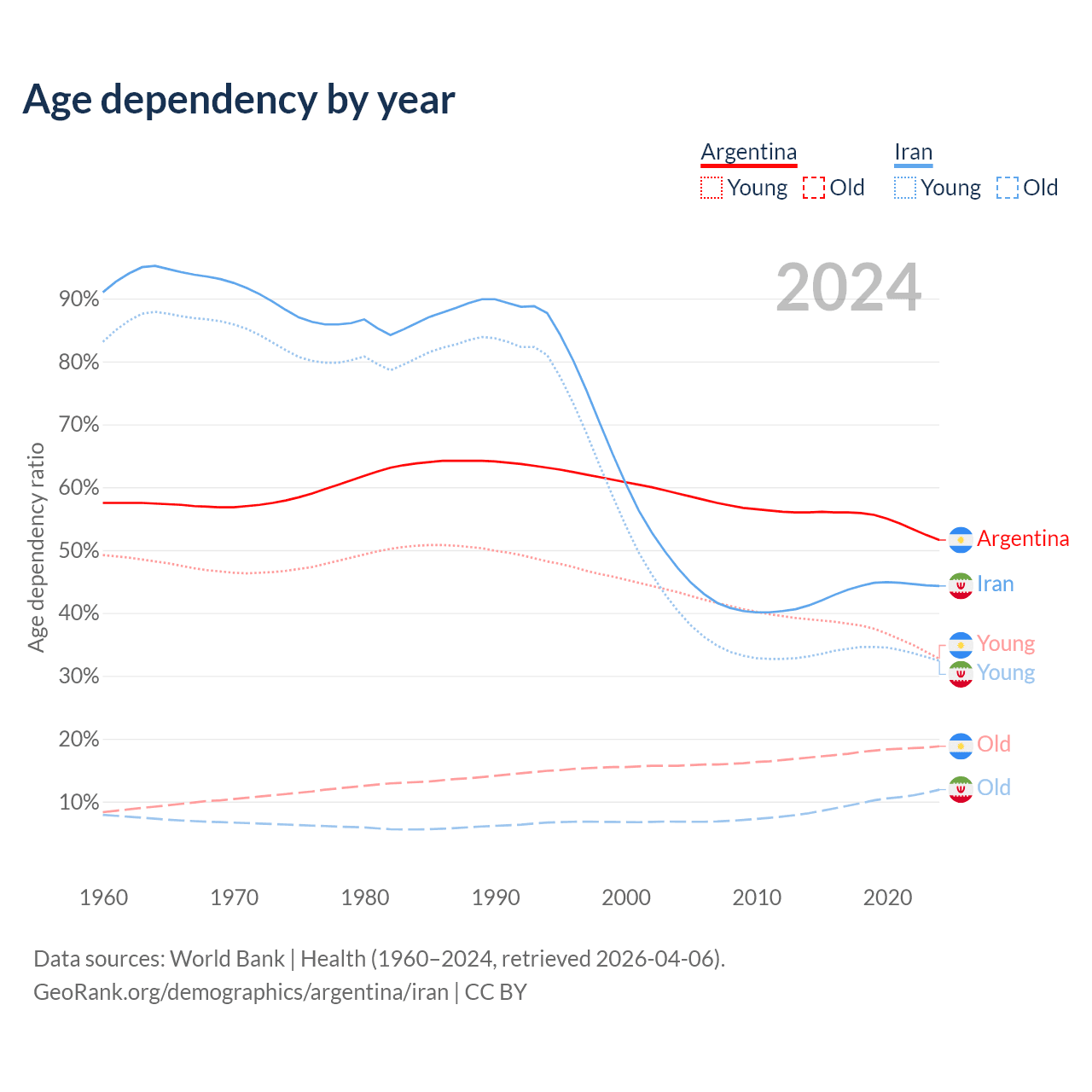 - Argentina is ranked 85/196 by median age (oldest to youngest) vs 79/196 for Iran.