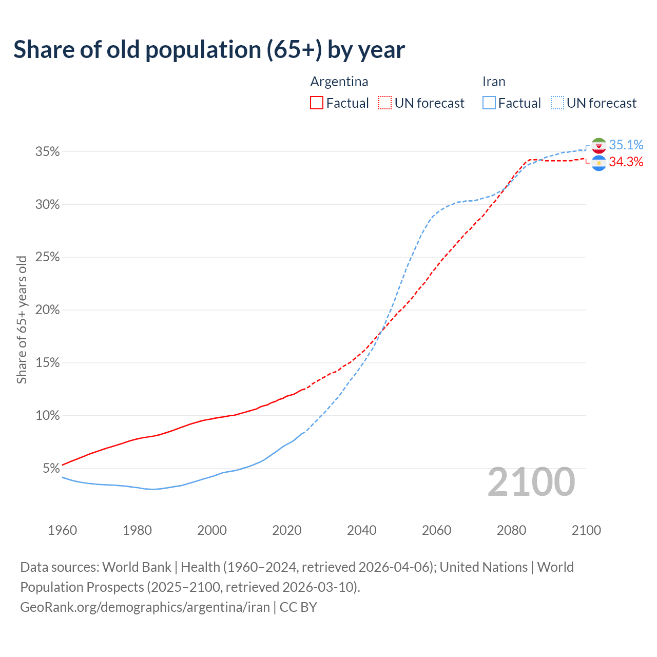 Median age Argentina vs Iran, 1960-2100