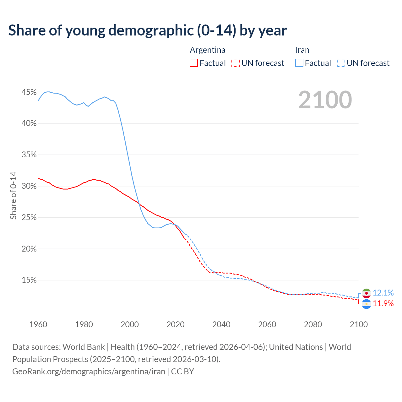 - The share of young demographic (0-15 years old) in Argentina is 21.6% vs 22.4% in Iran.