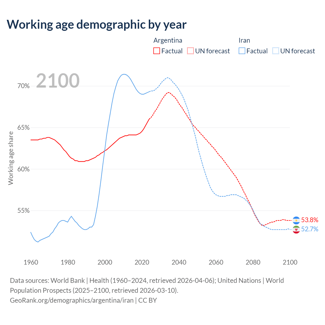 - Argentina has 30.4M working age adults (aged 15-64) vs 64.8M in Iran.