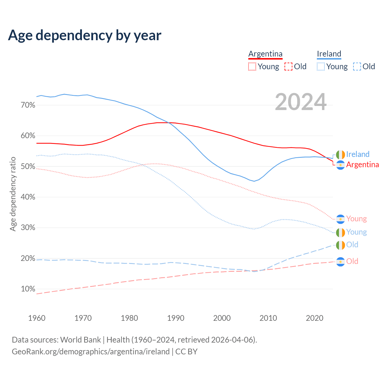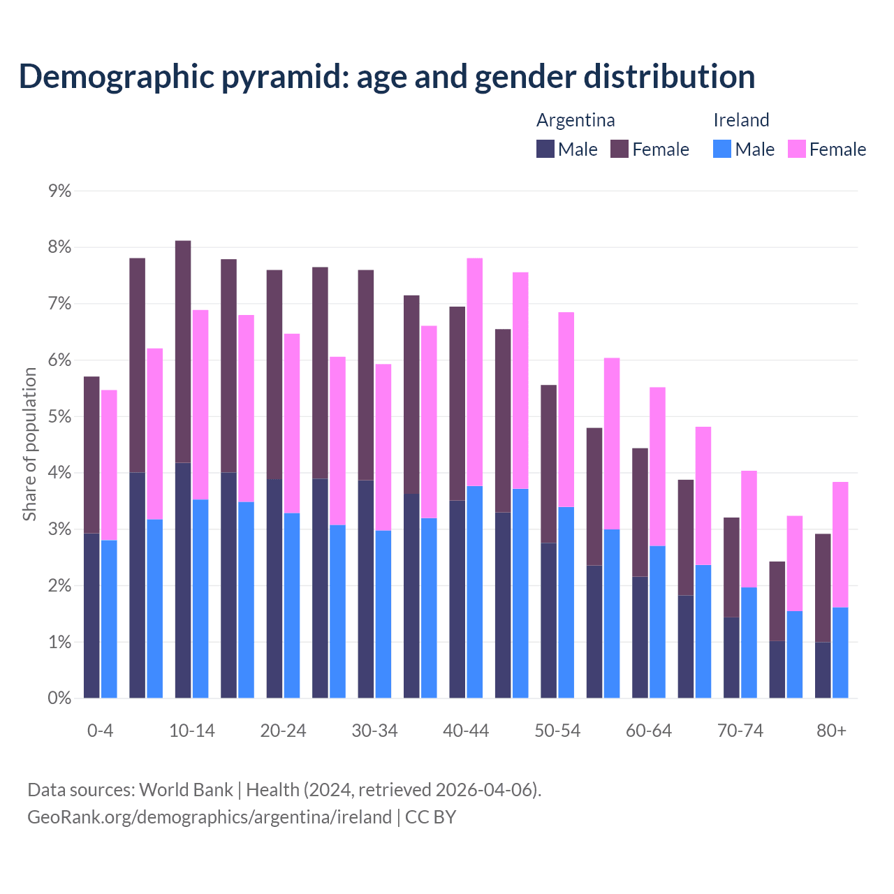 - Argentina is ranked 85/196 by median age (oldest to youngest) vs 48/196 for Ireland.