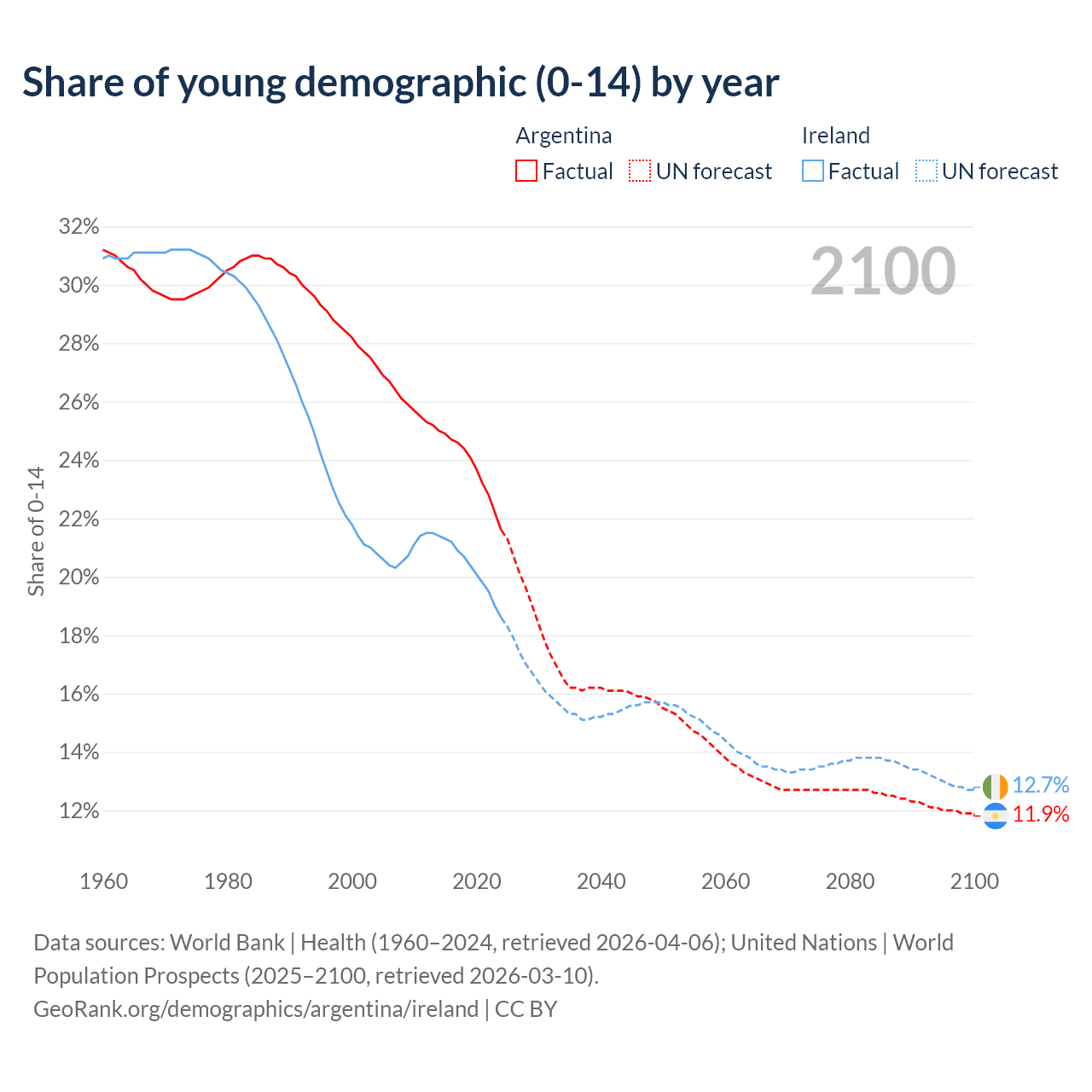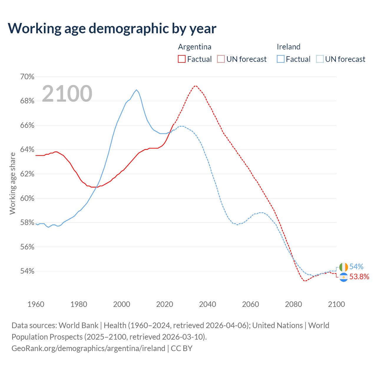Median age Argentina vs Ireland, 1960-2100