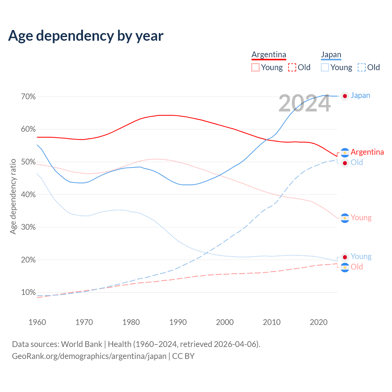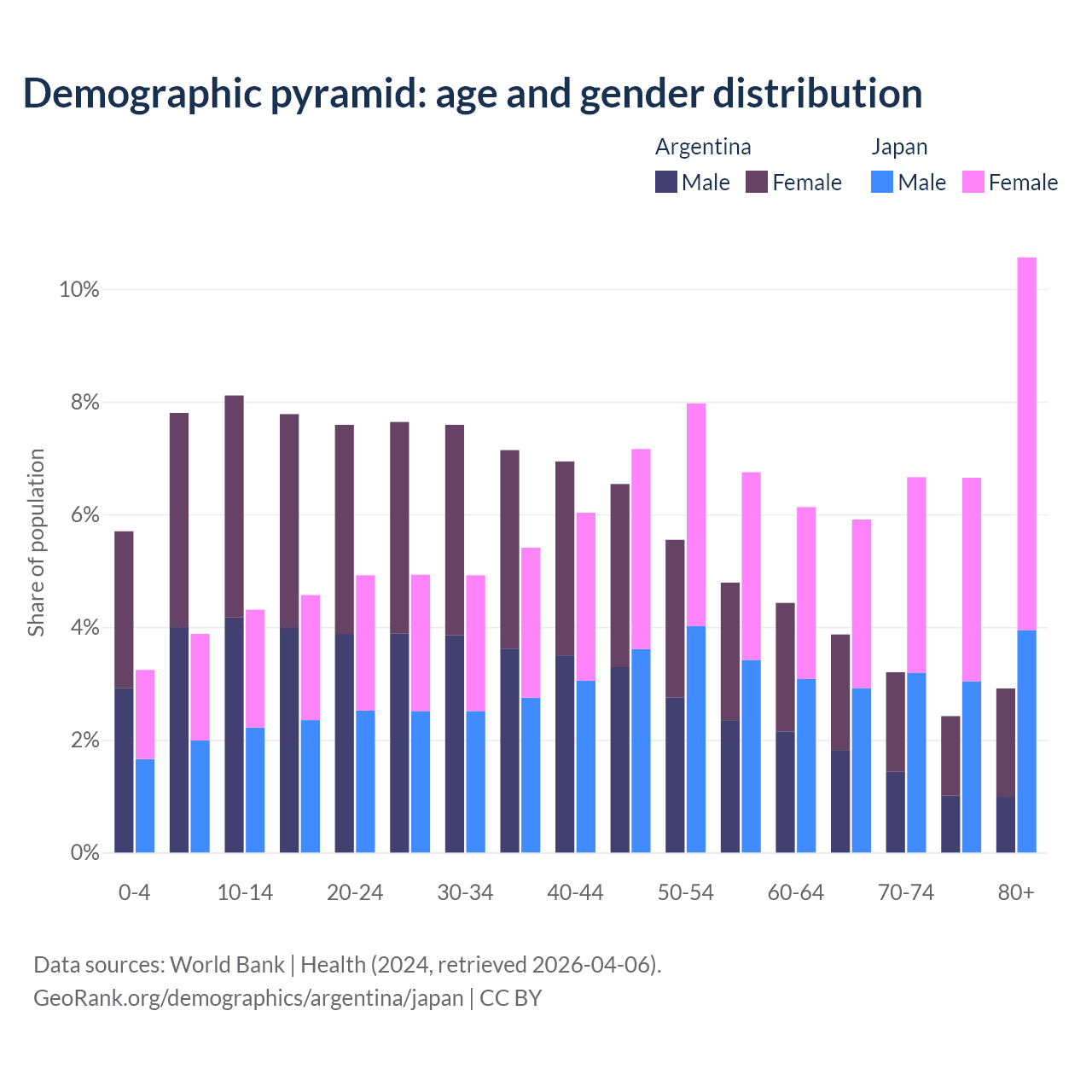 - Argentina is ranked 85/196 by median age (oldest to youngest) vs 2/196 for Japan.