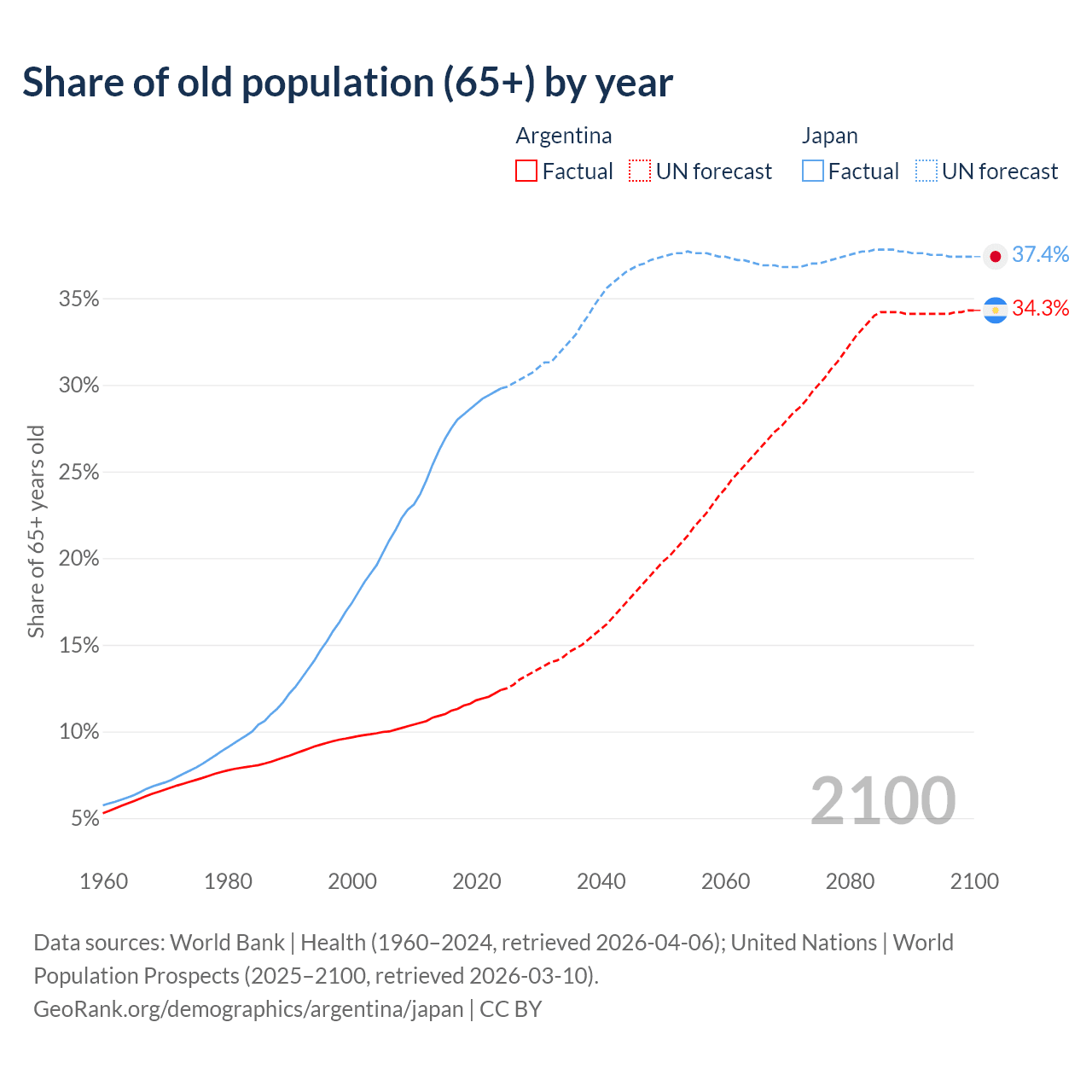 The share of older people aged 65 and over is 12.4% in Argentina and 29.8% in Japan. Life expectancy in Argentina compared to Japan .