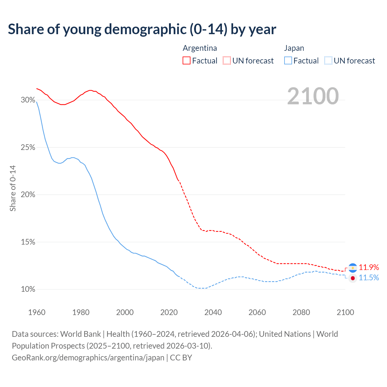 - The share of young demographic (0-15 years old) in Argentina is 21.6% vs 11.4% in Japan.