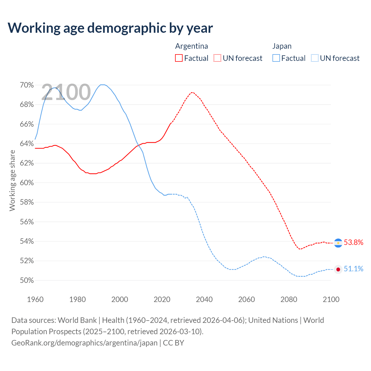 - Argentina has 30.4M working age adults (aged 15-64) vs 72.1M in Japan.