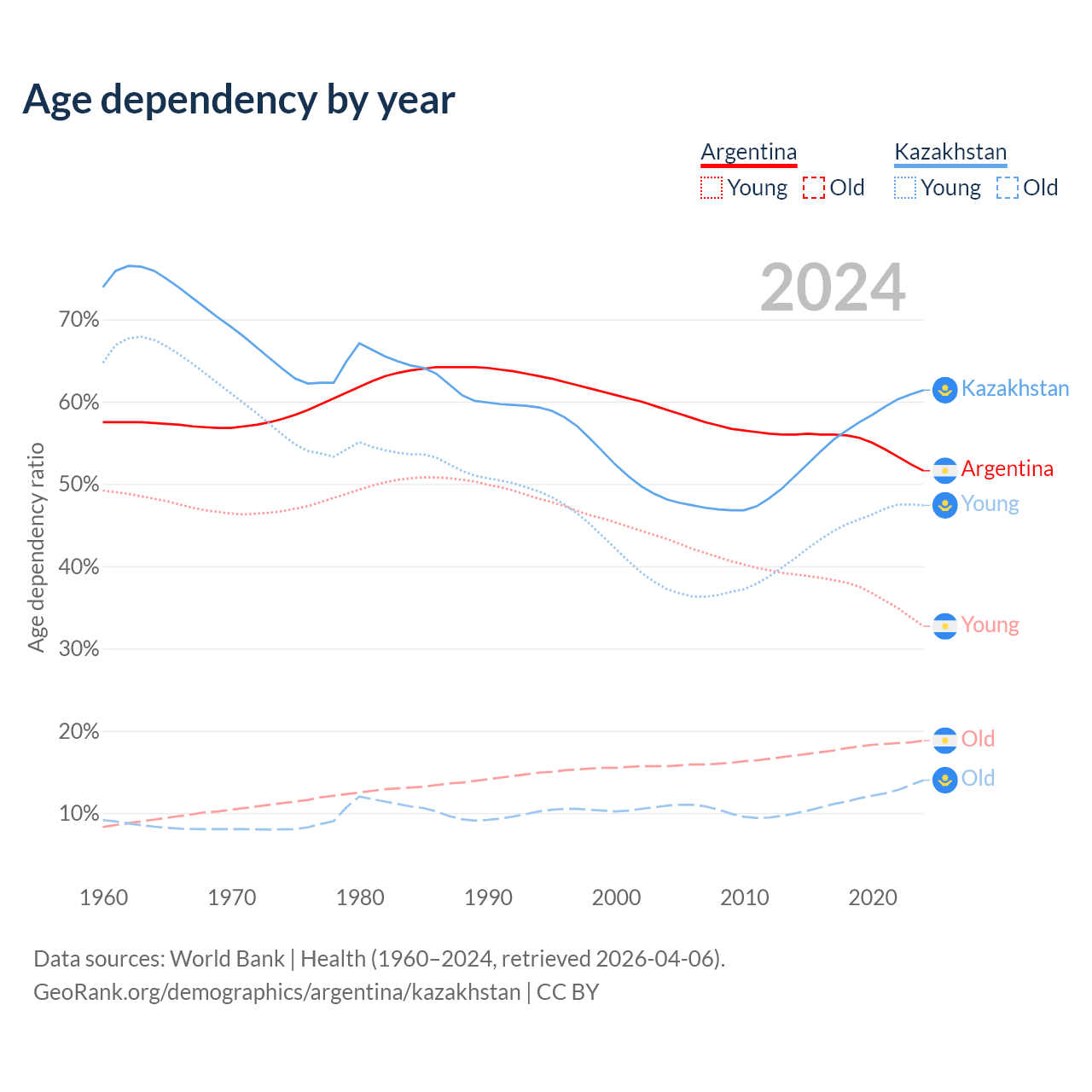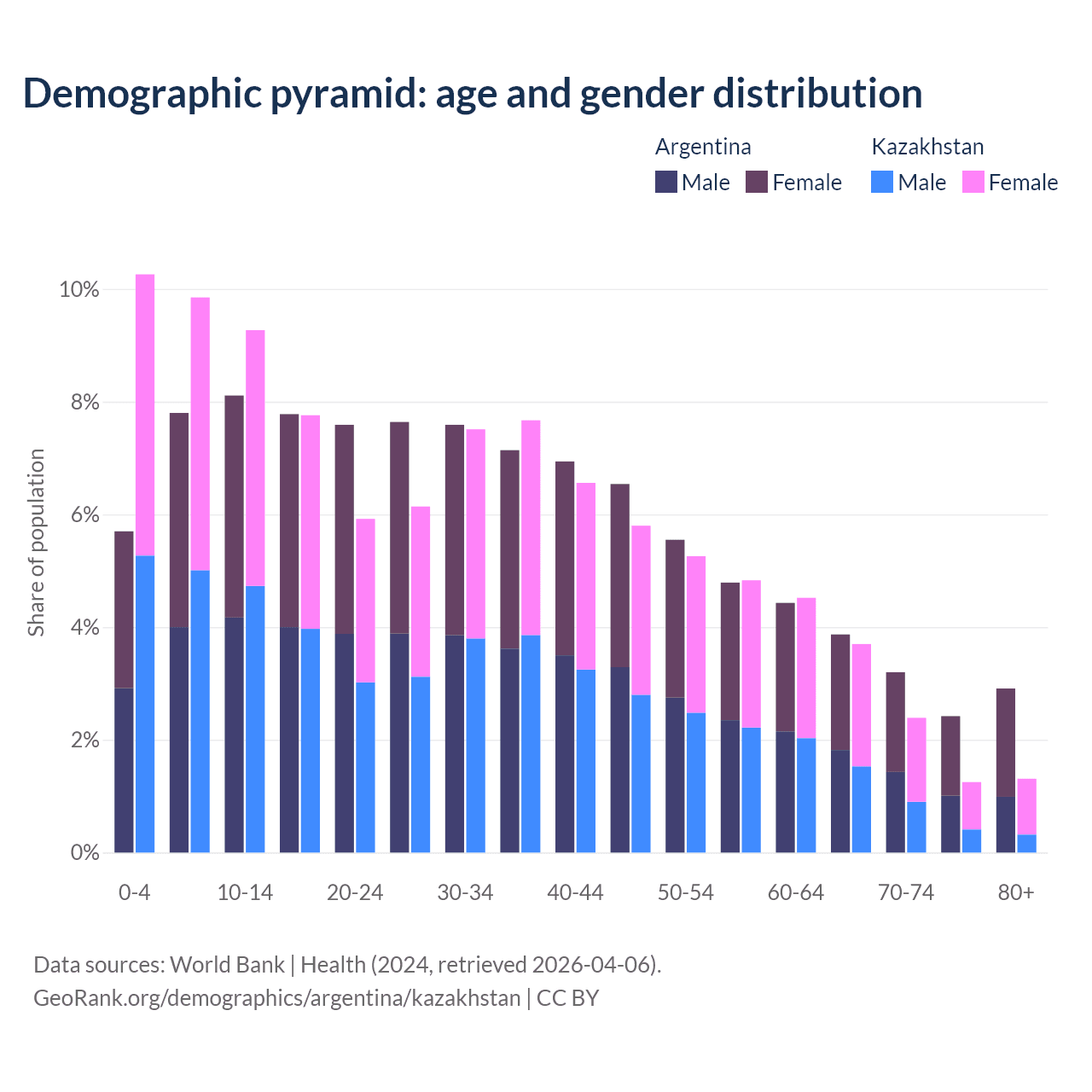 - Argentina is ranked 85/196 by median age (oldest to youngest) vs 99/196 for Kazakhstan.