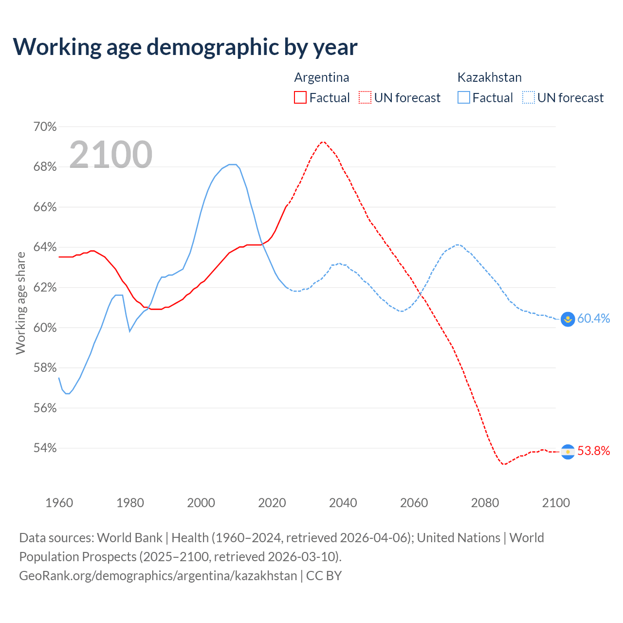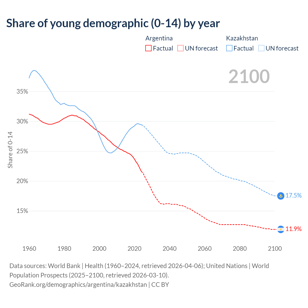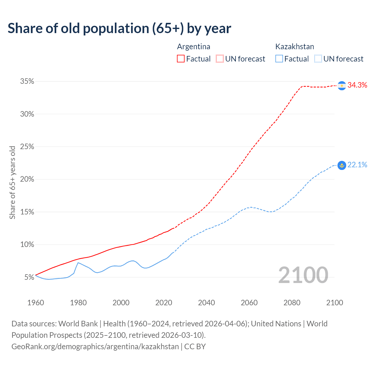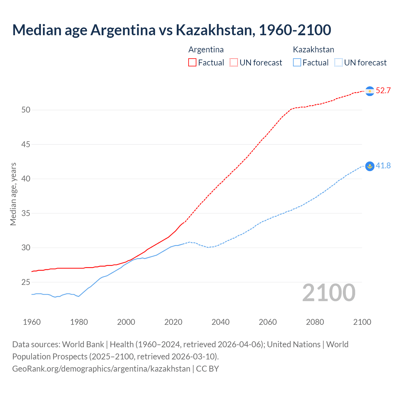 Median age Argentina vs Kazakhstan, 1960-2100