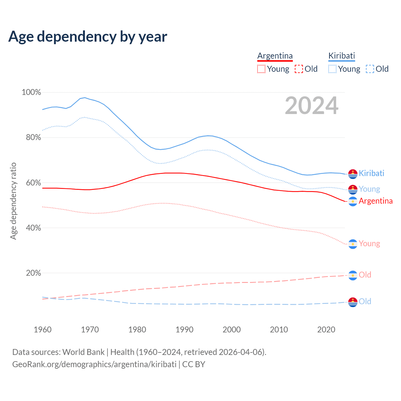 - The share of old-age demographic (65+) in Argentina is 12.4% vs 4.24% in Kiribati.