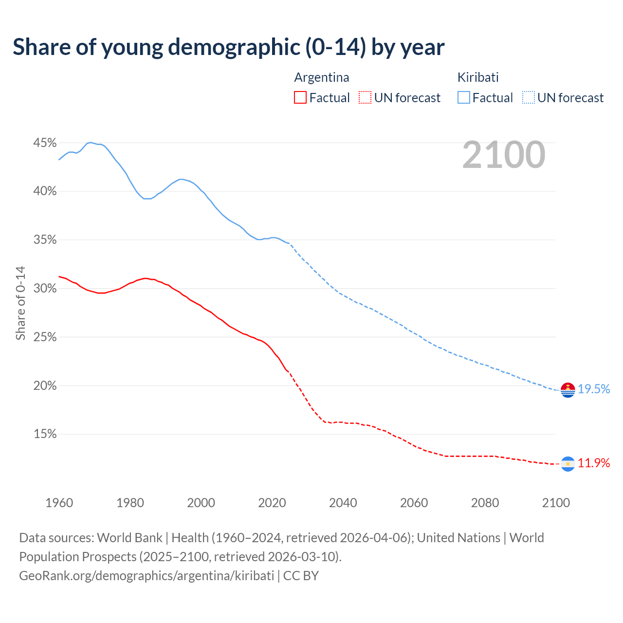 - The share of young demographic (0-15 years old) in Argentina is 21.6% vs 34.7% in Kiribati.