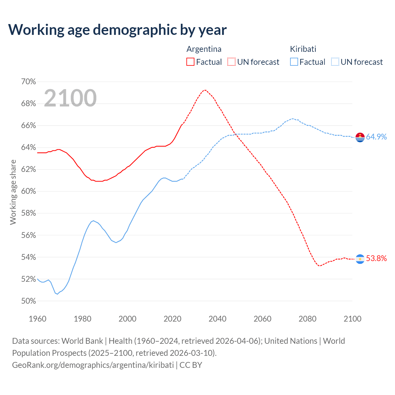 Median age Argentina vs Kiribati, 1960-2100