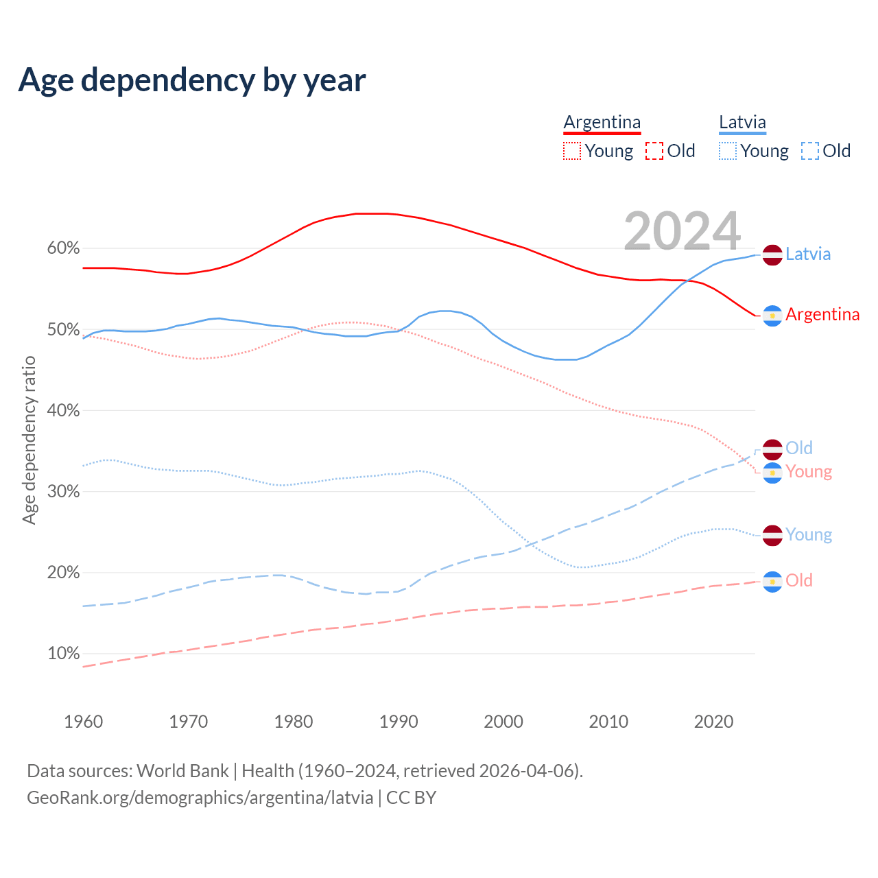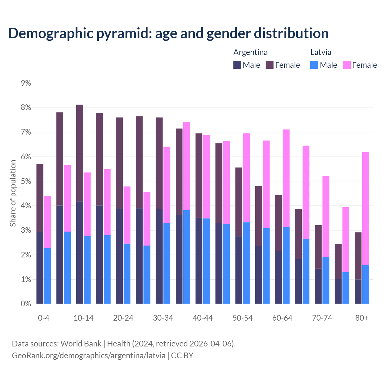 - Argentina is ranked 85/196 by median age (oldest to youngest) vs 20/196 for Latvia.