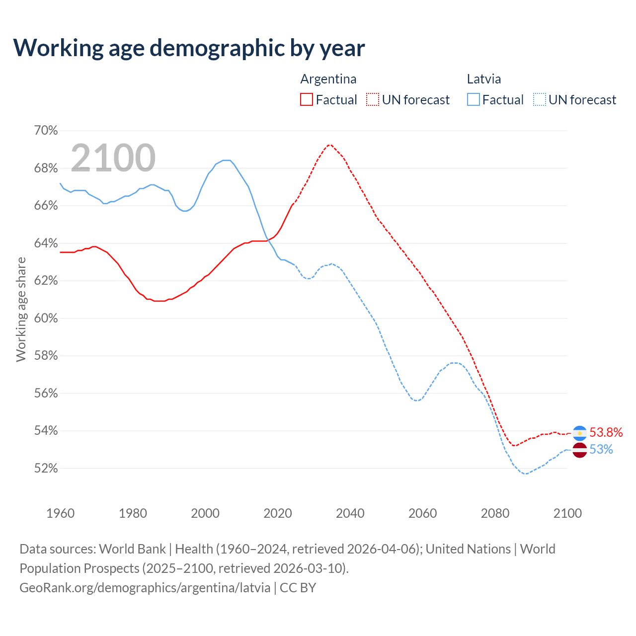 - Argentina has 30.4M working age adults (aged 15-64) vs 1.15M in Latvia.
